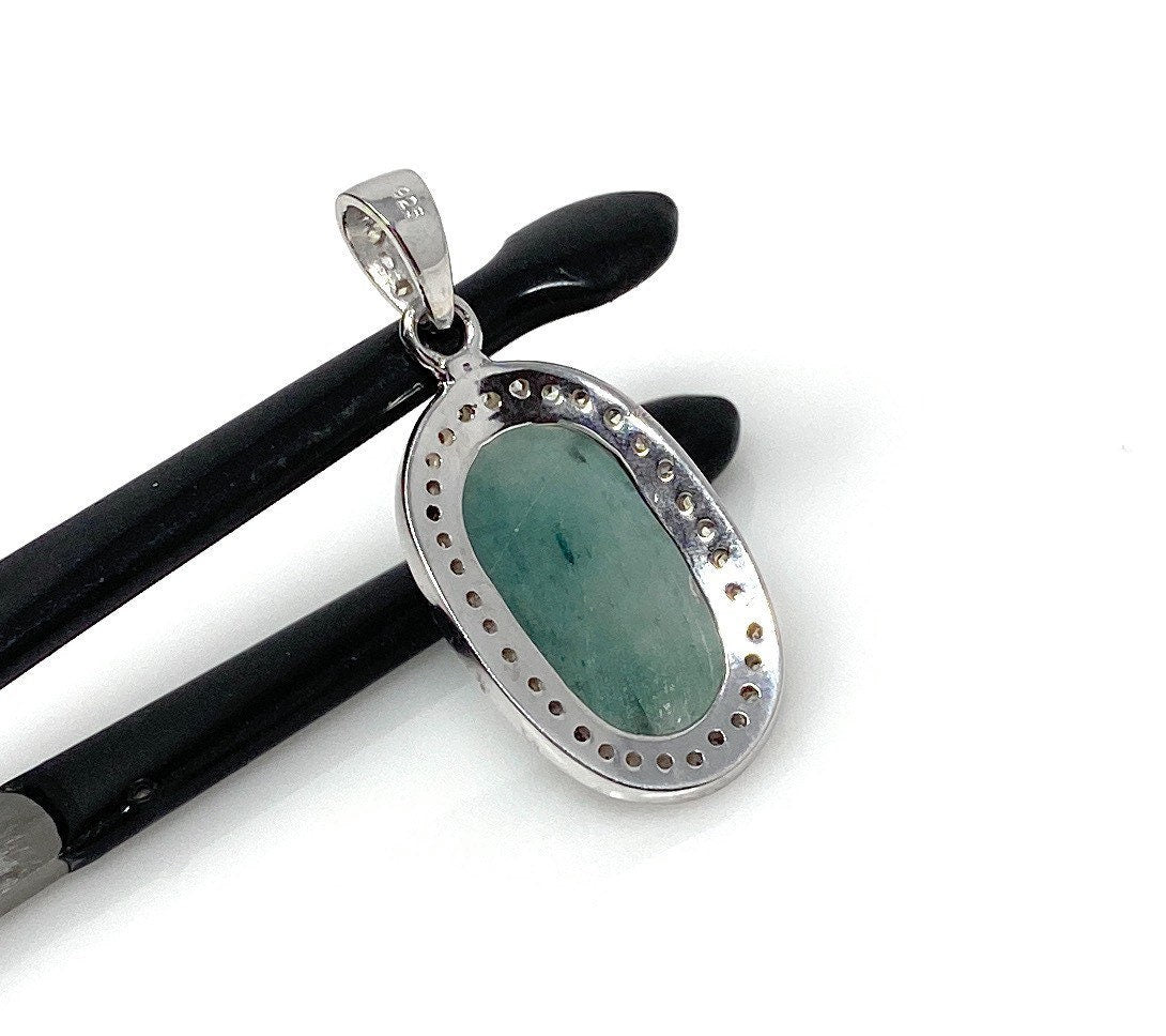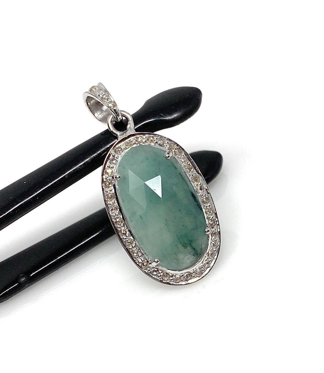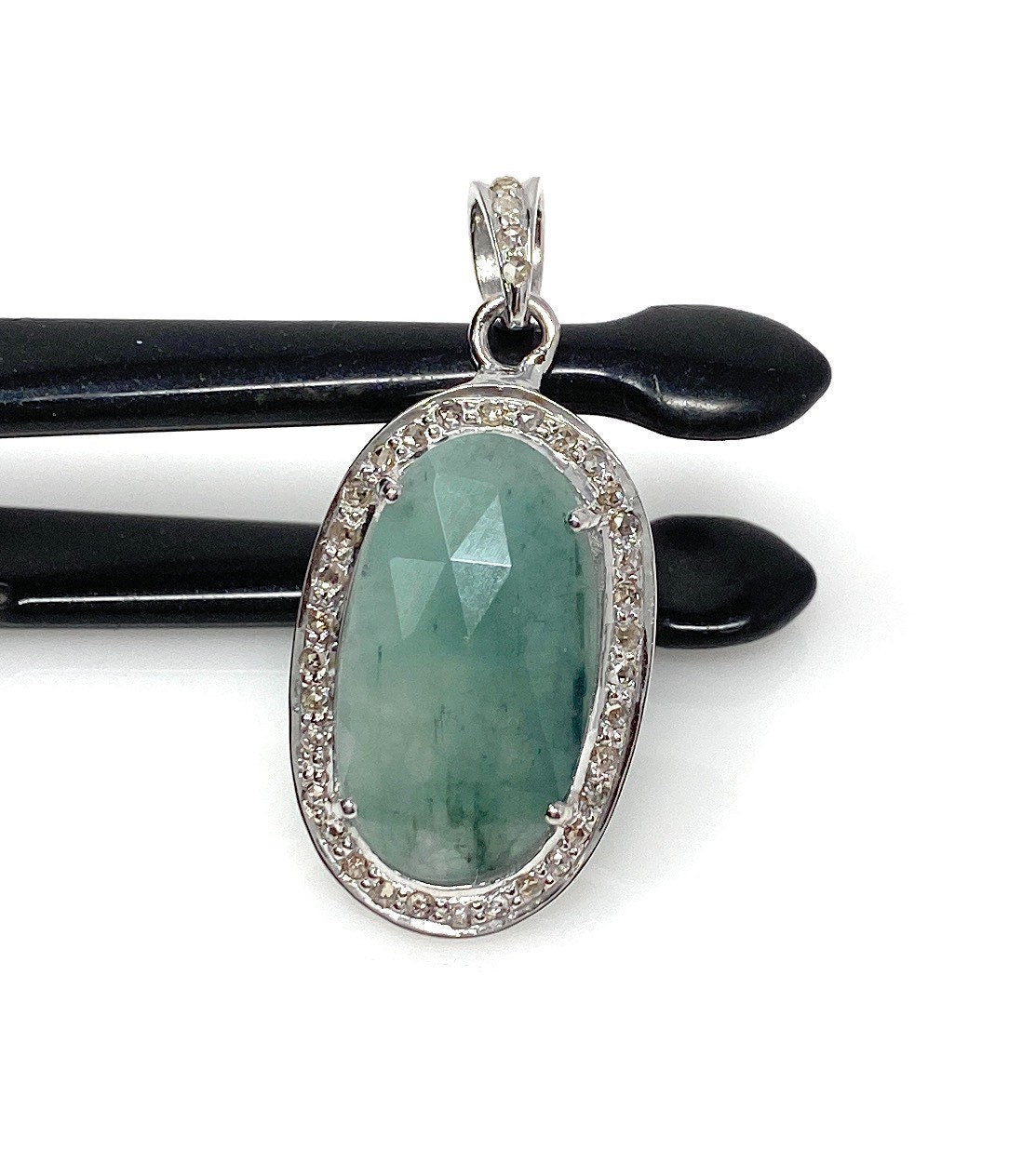 Emerald Diamond Pendant, Natural Emerald Sterling Silver Pendant, May Birthstone Pendant, Pave Diamond Pendant, 1.35” x 0.60”