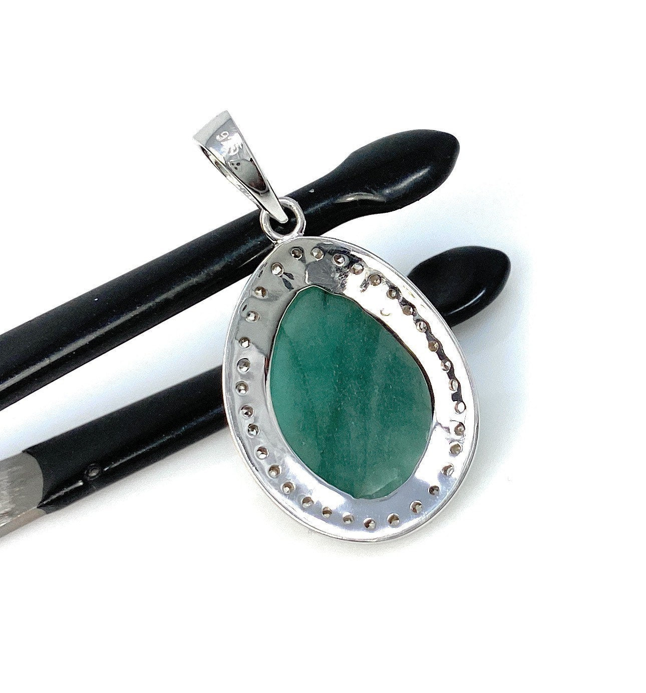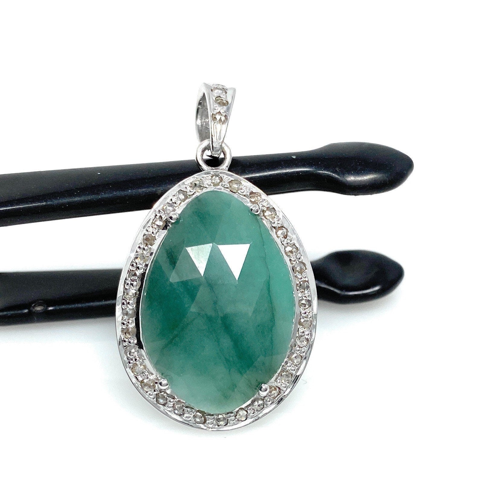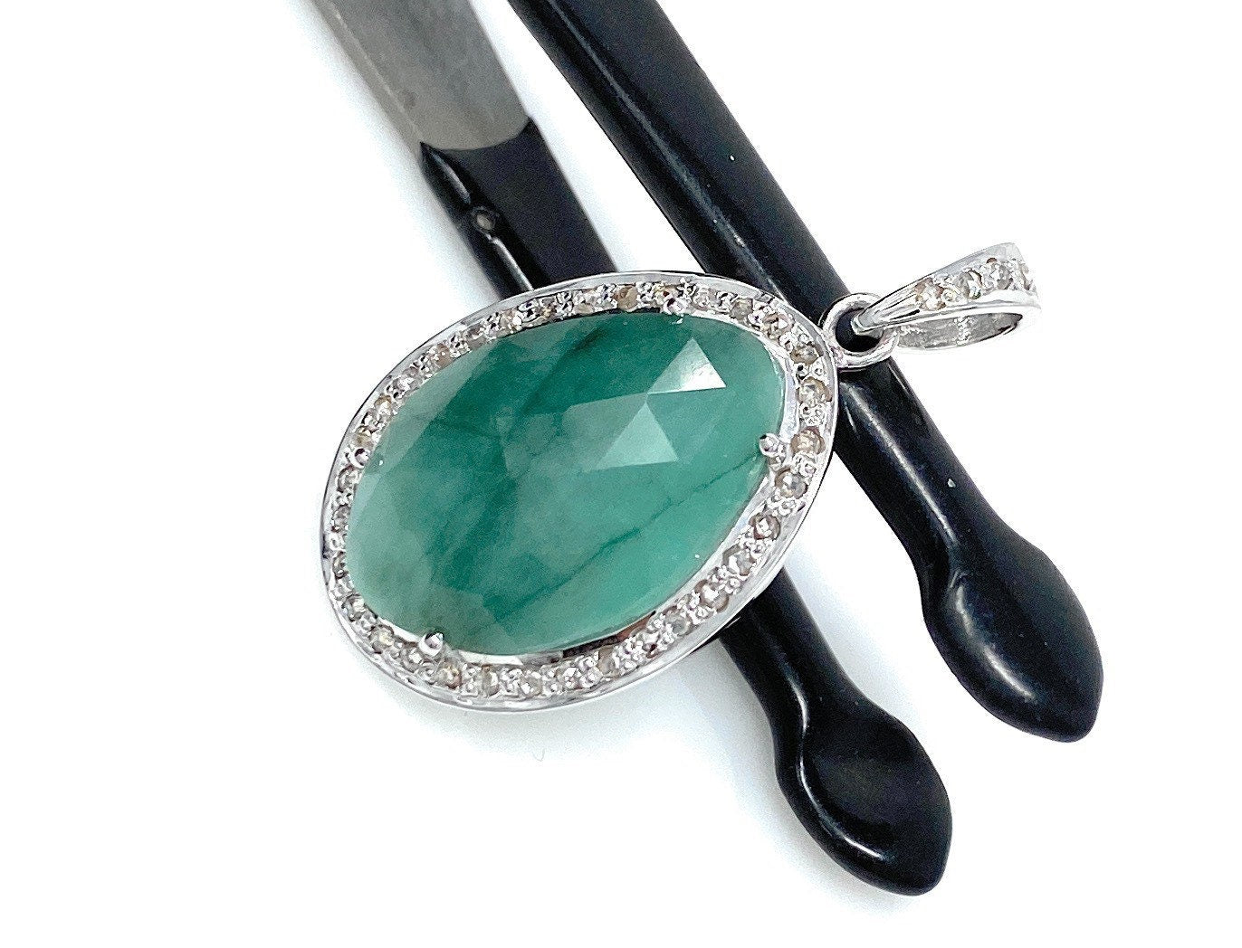 Emerald Diamond Pendant, Natural Emerald Sterling Silver Pendant, May Birthstone Pendant, Pave Diamond Pendant, 1.40” x 0.80”