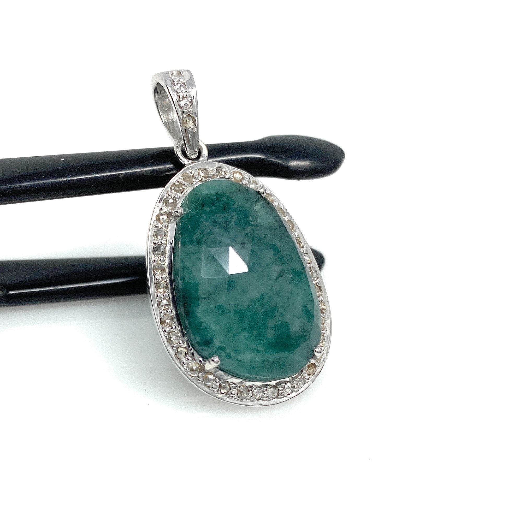 Emerald Diamond Pendant, Natural Emerald Sterling Silver Pendant, May Birthstone Pendant, Pave Diamond Pendant, 1.40” x 0.75”
