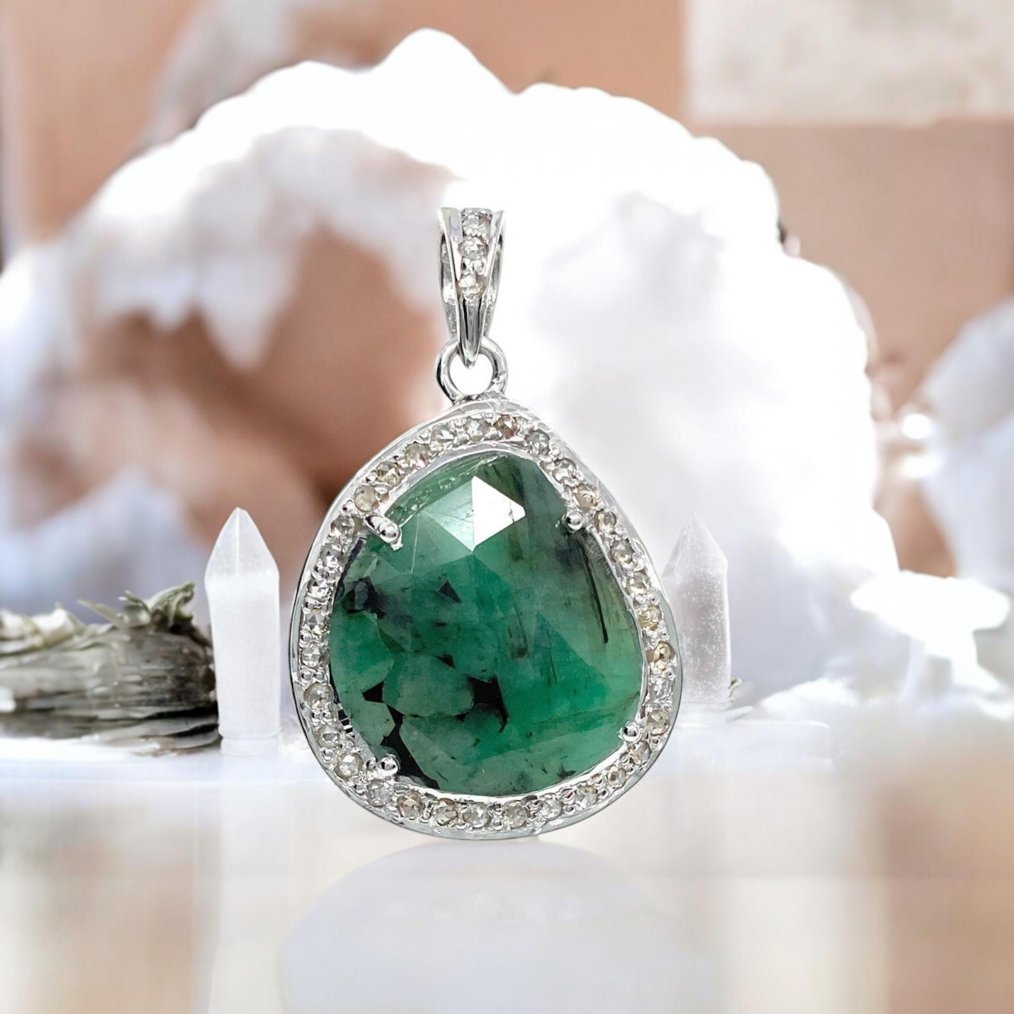 Emerald Diamond Pendant, Sterling Silver May Birthstone Pendant, Spiritual Healing Jewelry, Chakra Balancing Gemstone Pendant, 1.20” x 0.80”