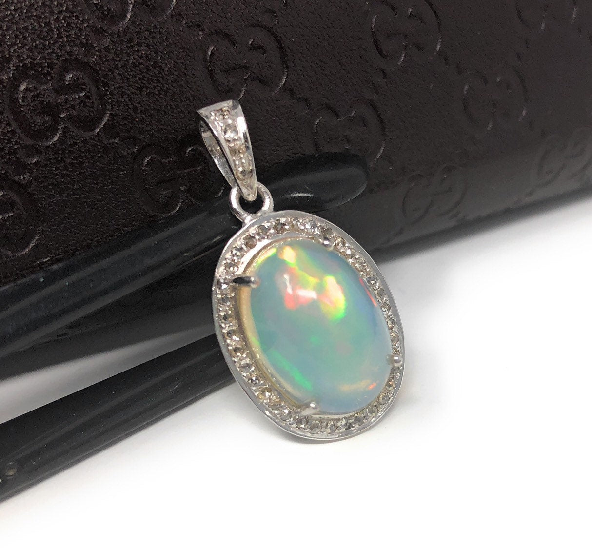 Ethiopian Opal Pendant, Gemstone Pendant, Diamond Pendant, Sterling Silver Opal Pendant, Pave Diamond Jewelry, Gifts for Her