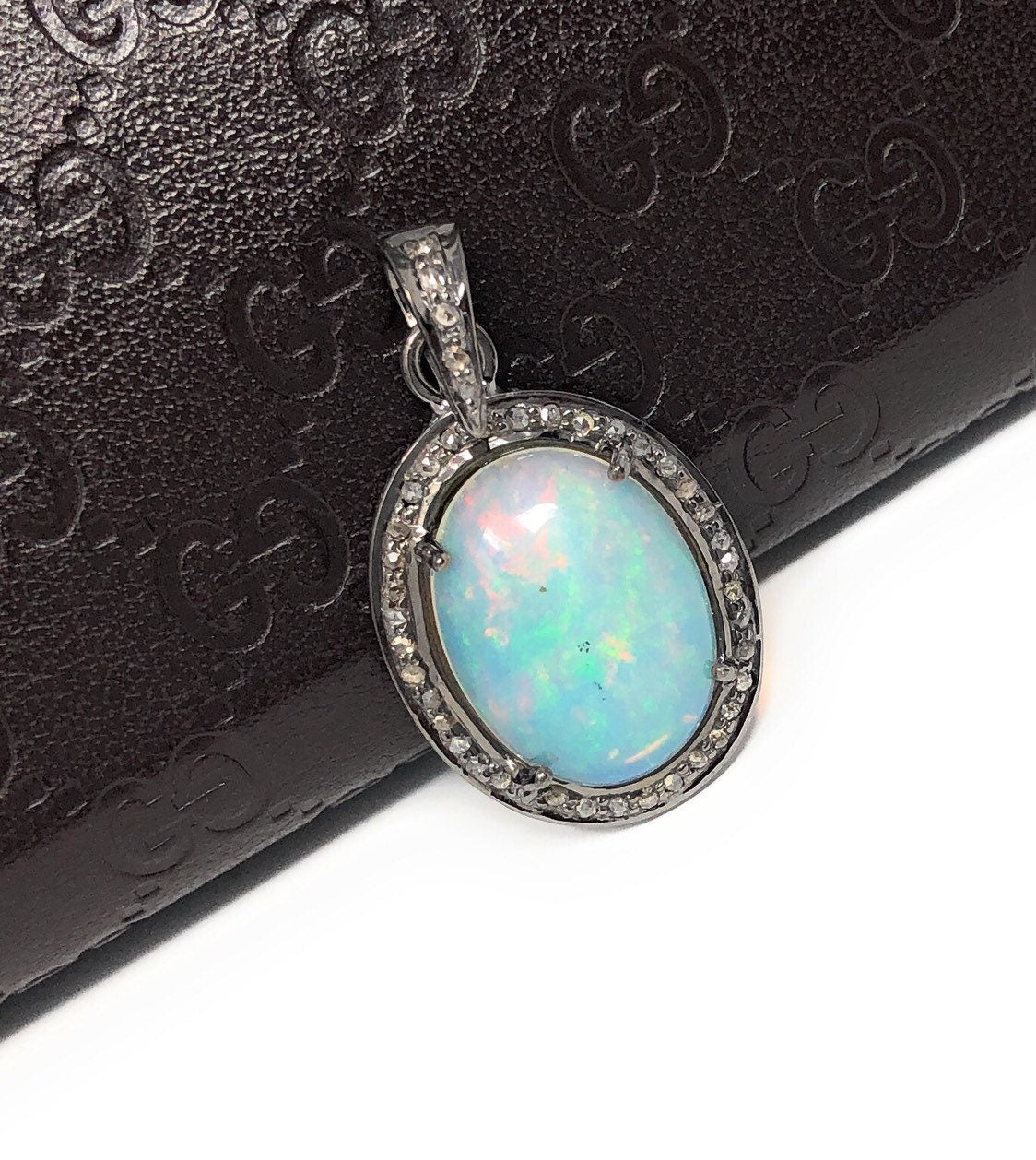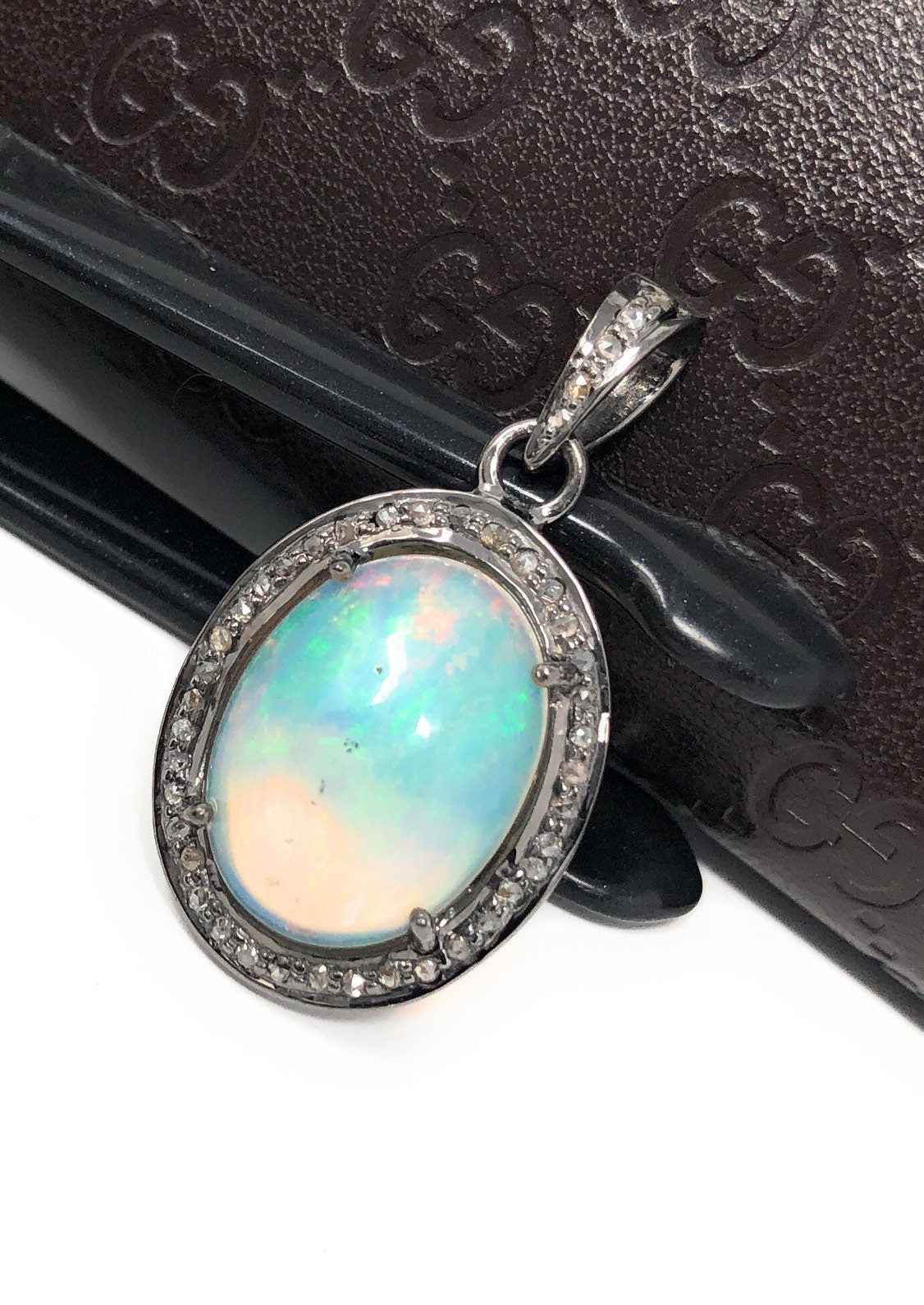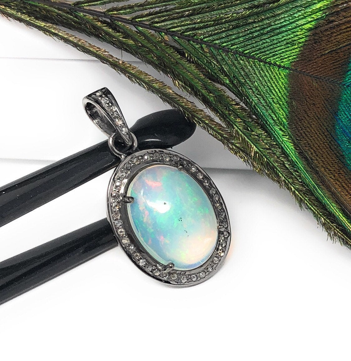 Ethiopian Opal Pendant, Gemstone Pendant, Diamond Pendant, Oxidized Sterling Silver Opal Pendant, Pave Diamond Jewelry, Gifts for Her