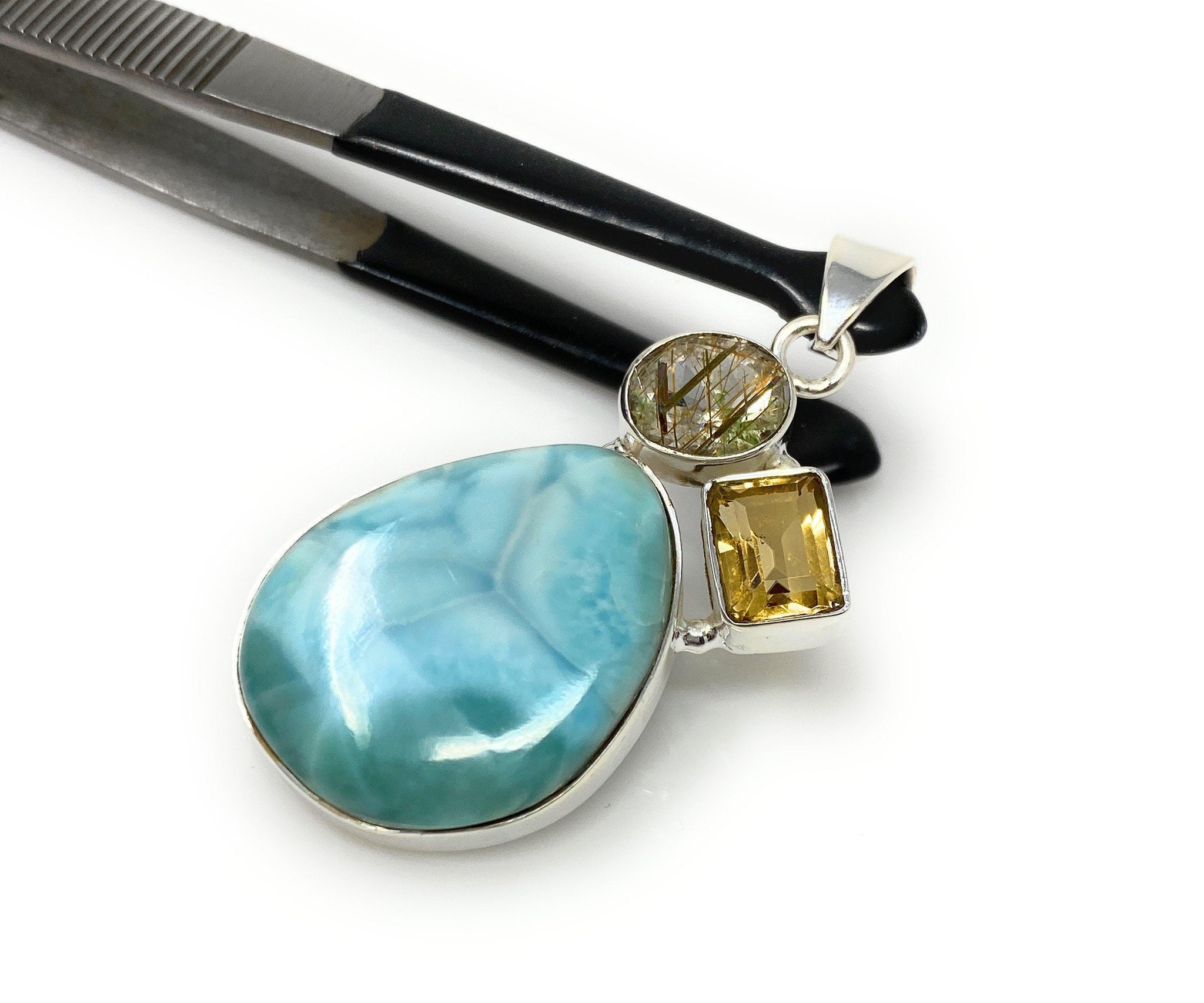 Gemstone Pendant - Larimar, Citrine and Golden Rutile, Bohemian Jewelry, Larimar Pendant, Sterling Silver Jewelry