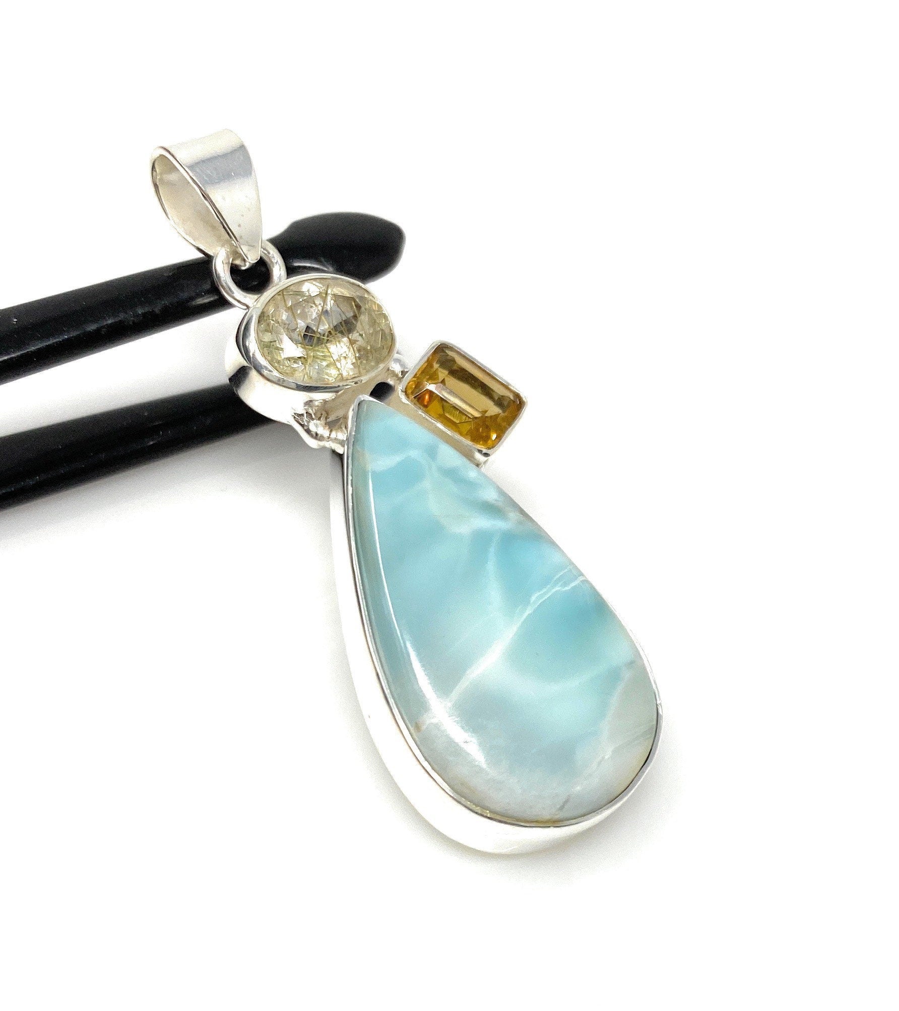 This Beautiful Handmade 925 Sterling Silver Designer Pendant is made with using Smooth Larimar Cabochon and Cut Stone Rutilated Quartz and Citrine. It is an excellent choice for any occasion and makes a great gift for the loved ones.