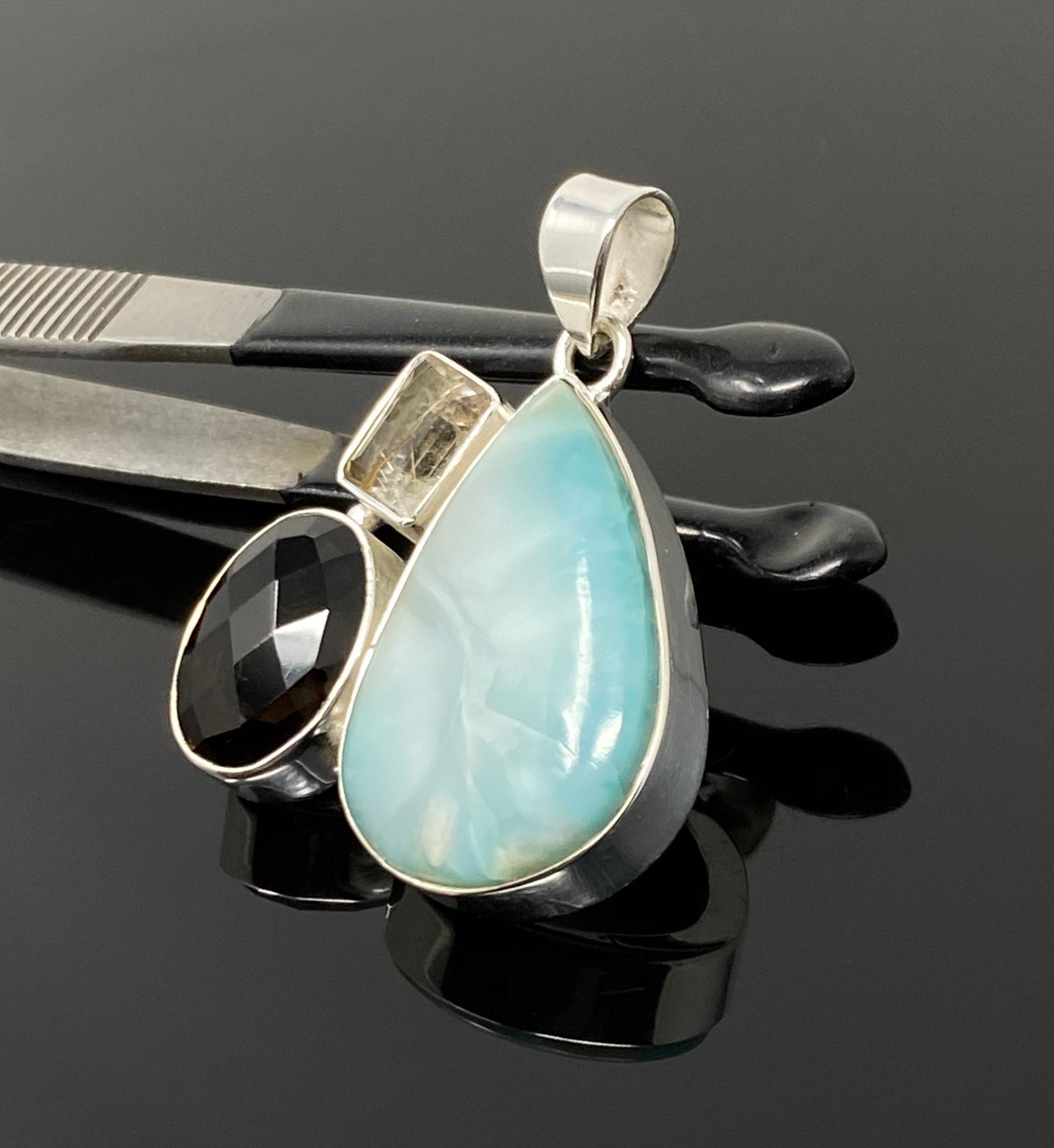 Natural Larimar with Smokey Quartz and Golden Rutile Gemstone Sterling Silver Pendant DIY Jewelry at Wholesale Price.