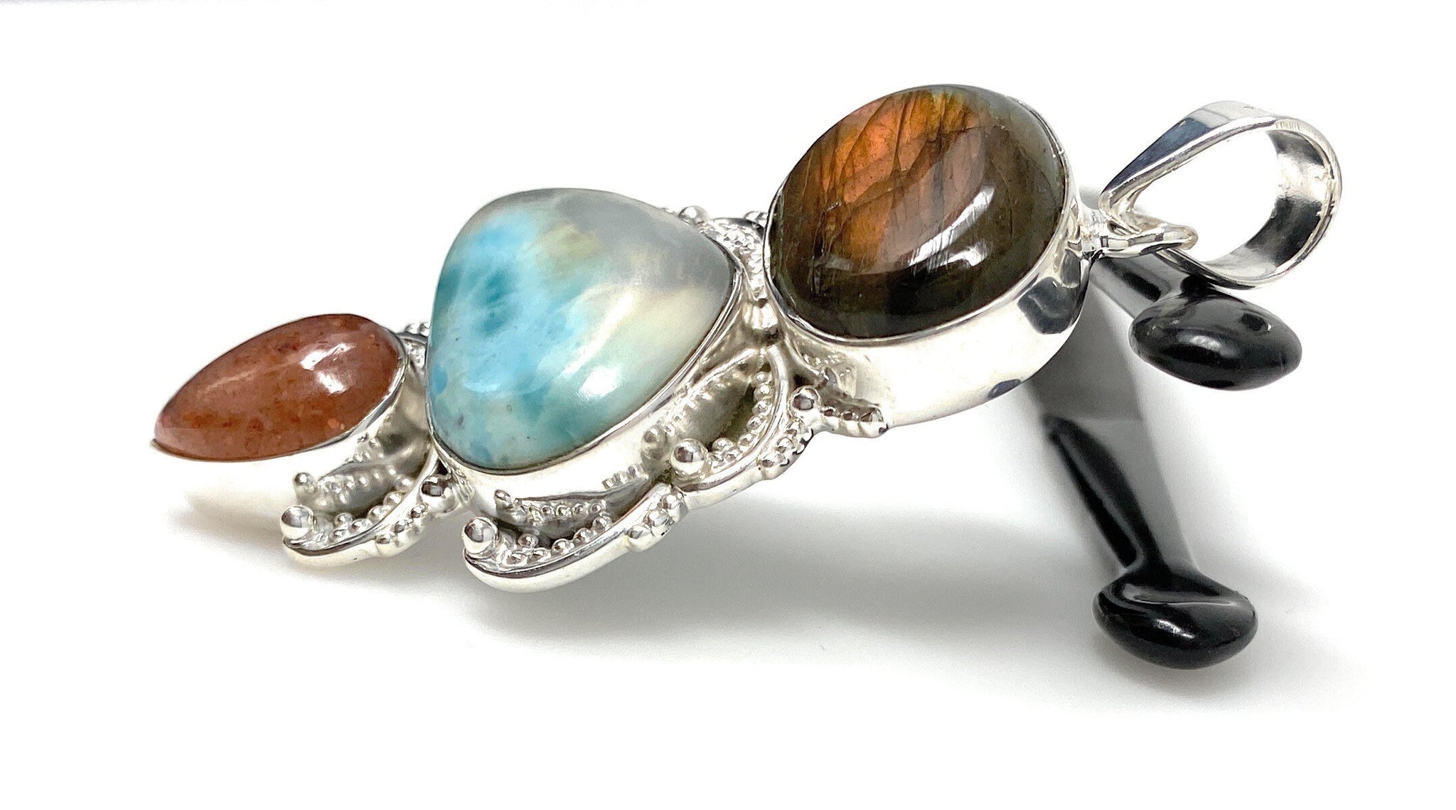 Larimar, Sunstone and Labradorite Gemstone Sterling Silver Wire Wrapped Pendant Jewelry at Wholesale Price.