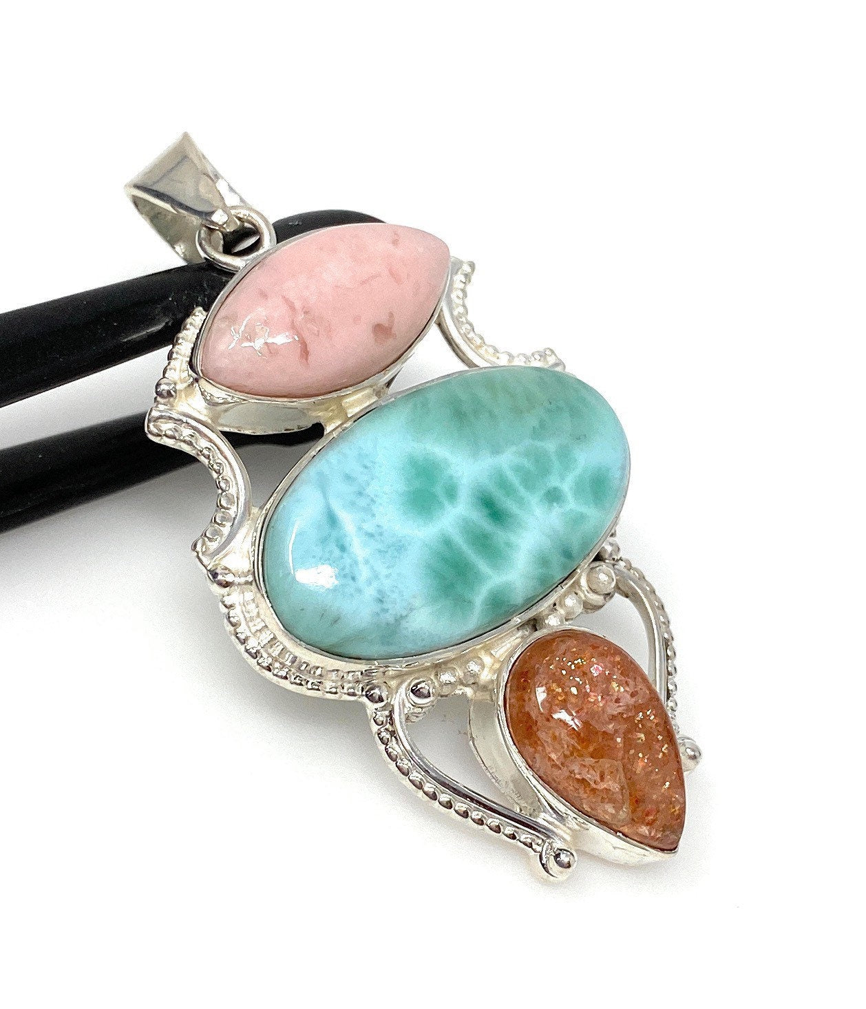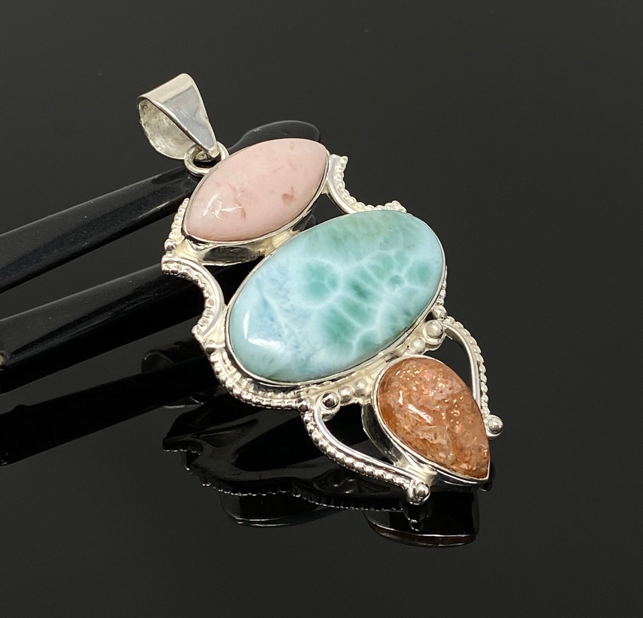 Larimar, Sunstone and Pink Opal Gemstone Sterling Silver Wire Wrapped Pendant Jewelry at Wholesale Price.