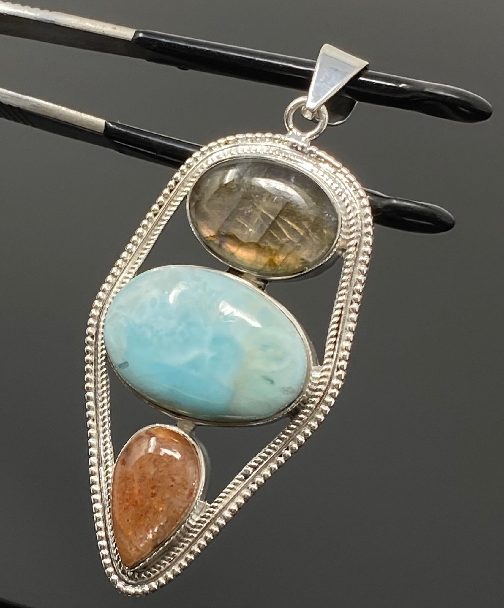 Larimar, Sunstone and Labradorite Gemstone Sterling Silver Wire Wrapped Pendant Jewelry at Wholesale Price.