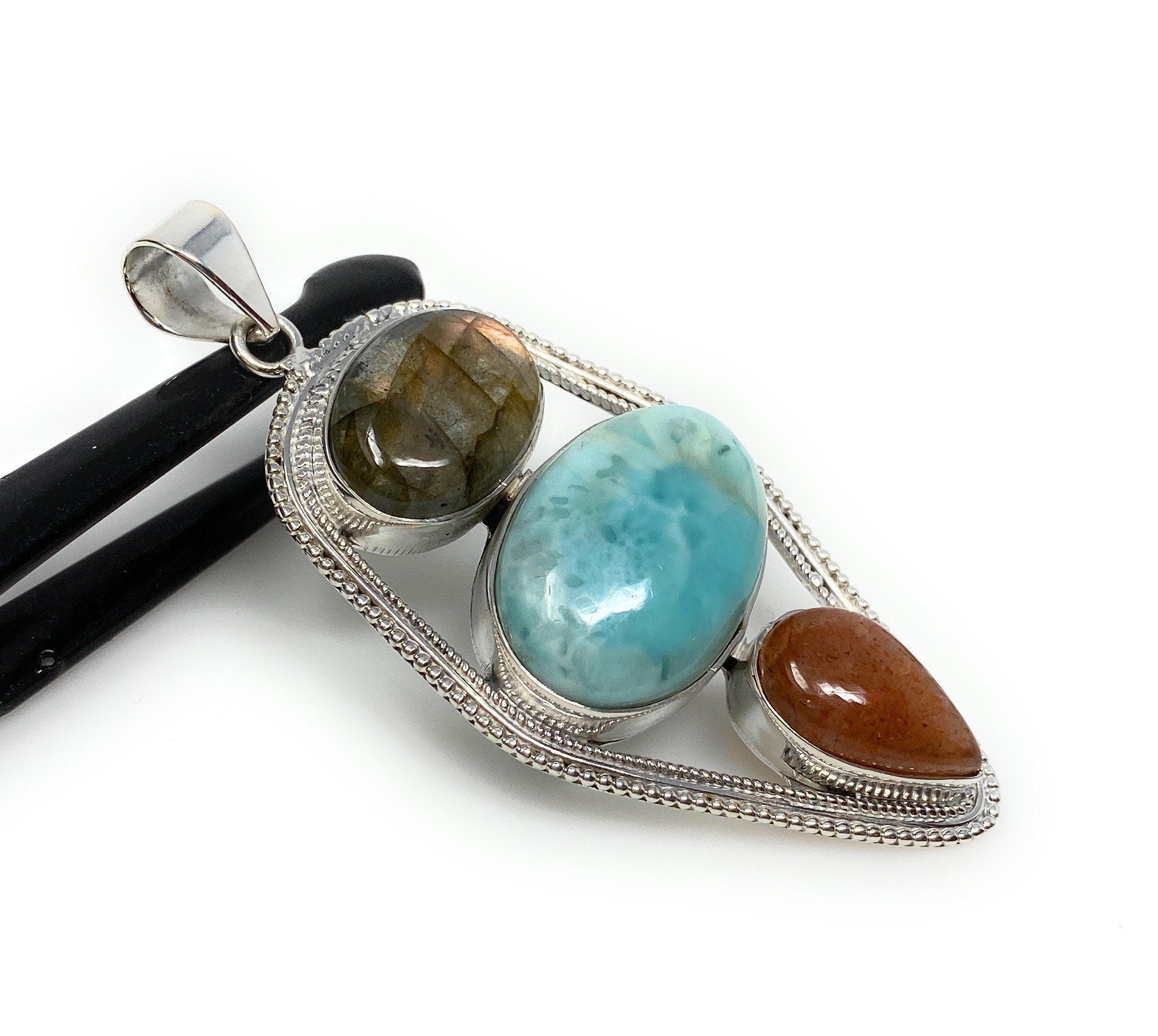 This beautiful Handmade Natural Sunstone, Natural Labradorite and Natural Dominican Republic Larimar 925 Sterling Silver Pendant is made with the wire wrapped design which makes the pendant unique and designer and is an excellent choice for any occasion and makes a great gift for the loved ones.