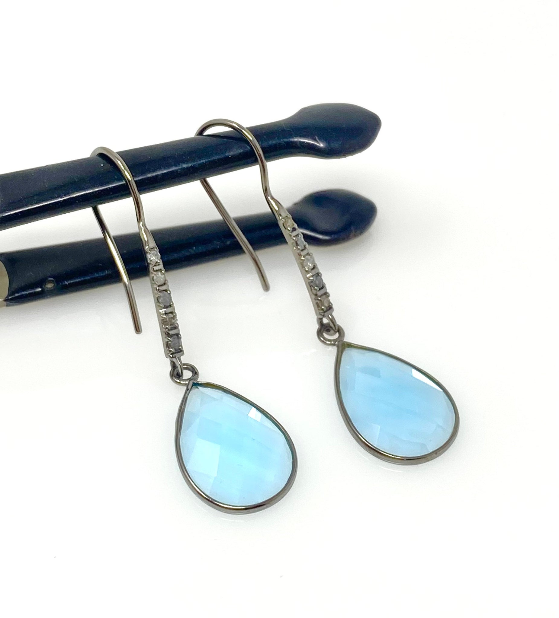 Genuine Blue Topaz Pave Diamond Earrings, Black Rhuthenium over Sterling Silver Gemstone Earrings, Vintage Jewelry
