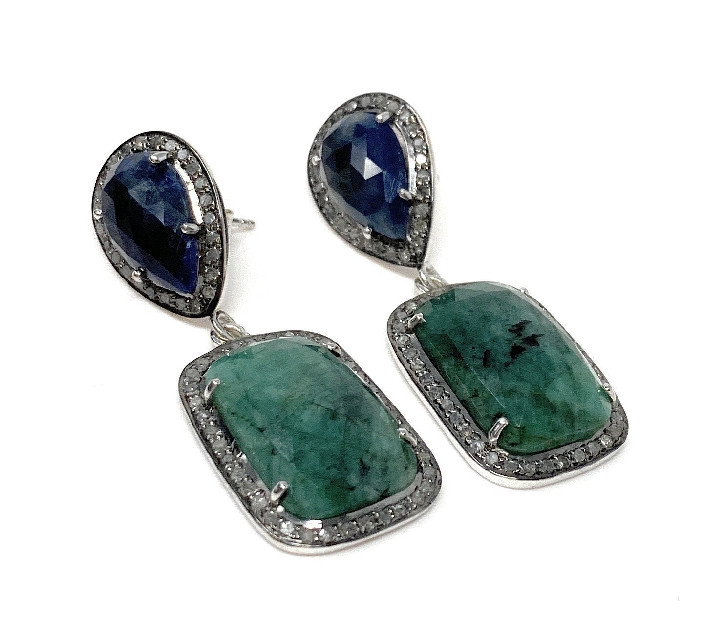 Genuine Emerald and Blue Sapphire Pave Diamond Earrings, Sapphire Earrings, Emerald Earrings, Gifts for Her