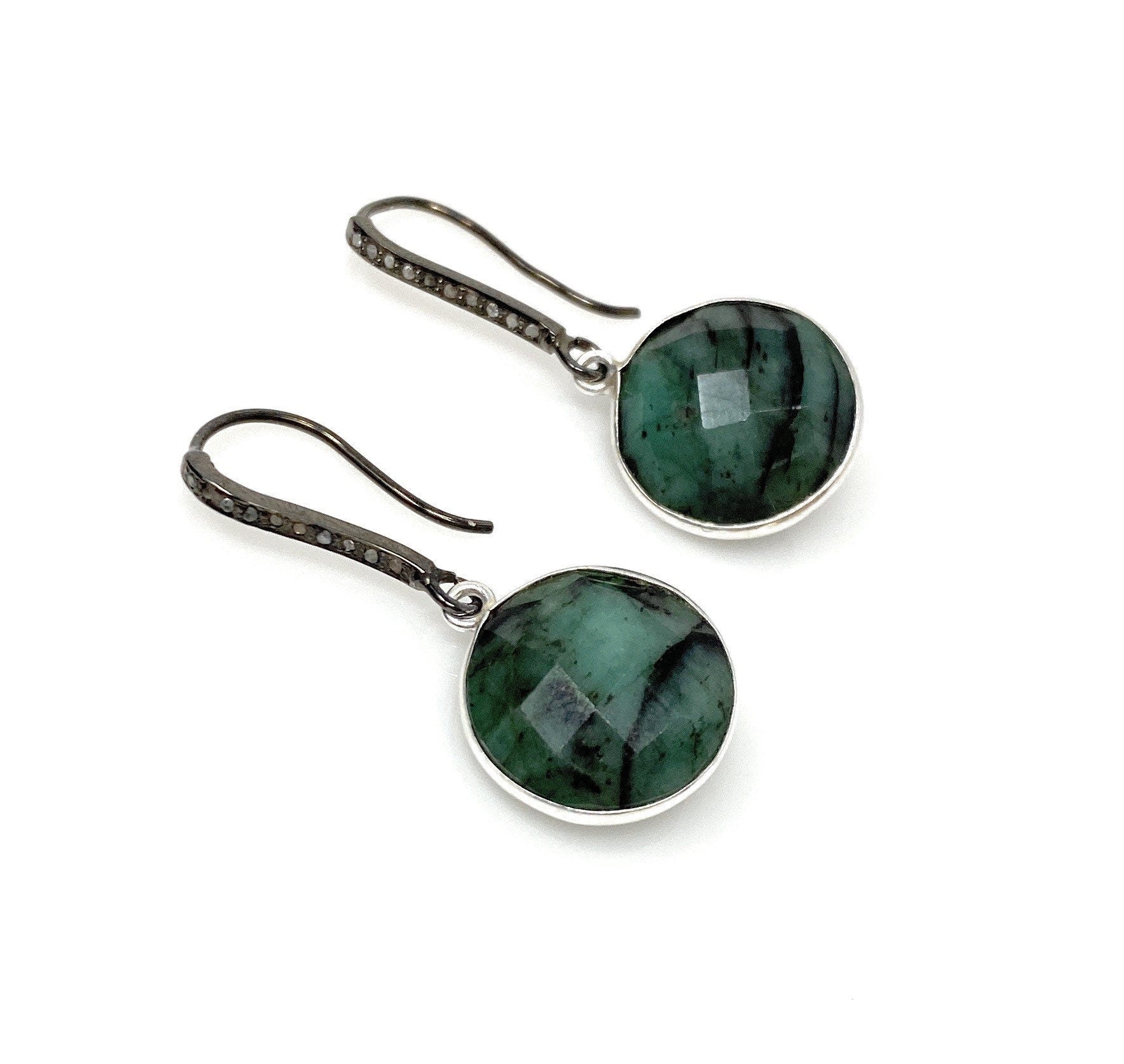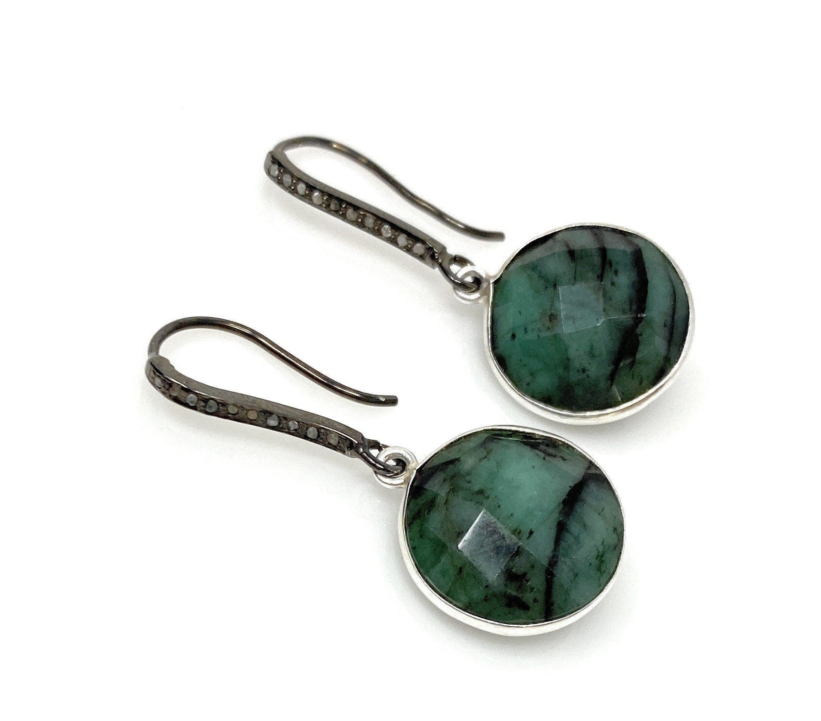 These beautiful Earrings are made with meticulous care using genuine diamonds on Black Rhodium Sterling Silver Ear Wires and Faceted Emerald bezel set in Sterling Silver.