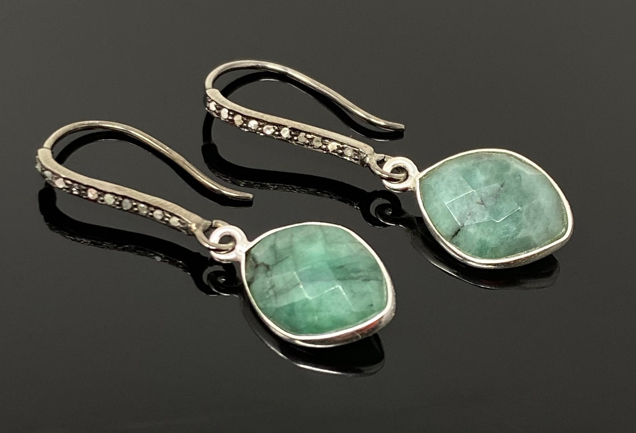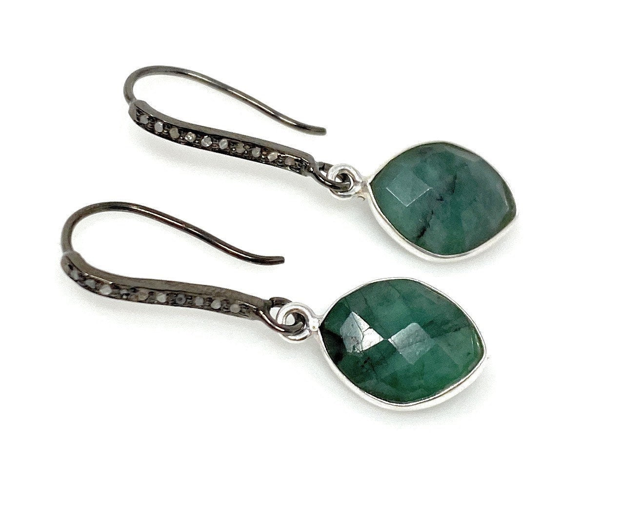 These beautiful Earrings are made with meticulous care using genuine diamonds on Black Rhodium Sterling Silver Ear Wires and Faceted Emerald bezel set in Sterling Silver.