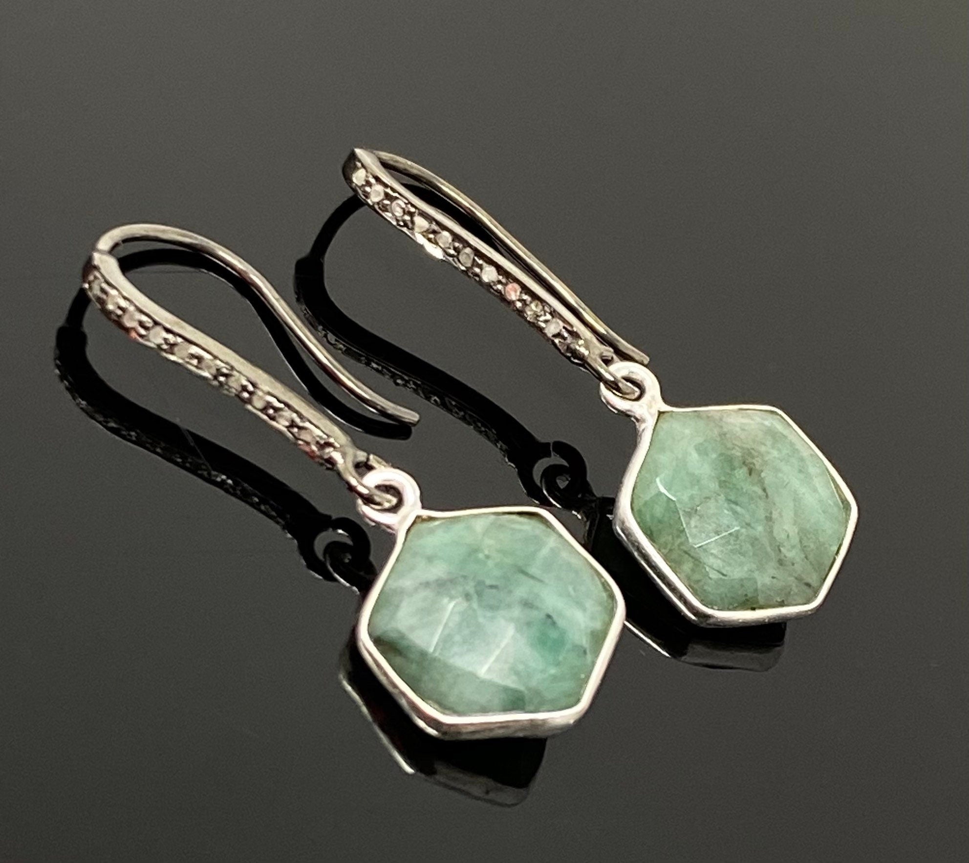 These beautiful Earrings are made with meticulous care using genuine diamonds on Black Rhodium Sterling Silver Ear Wires and Faceted Emerald bezel set in Sterling Silver.