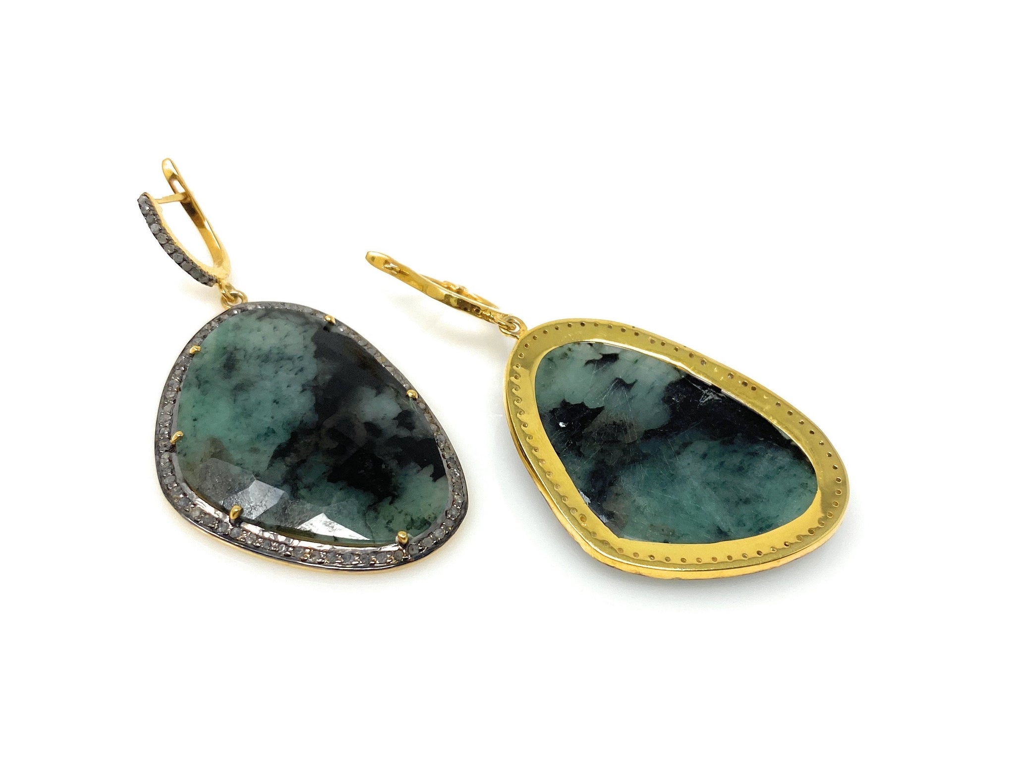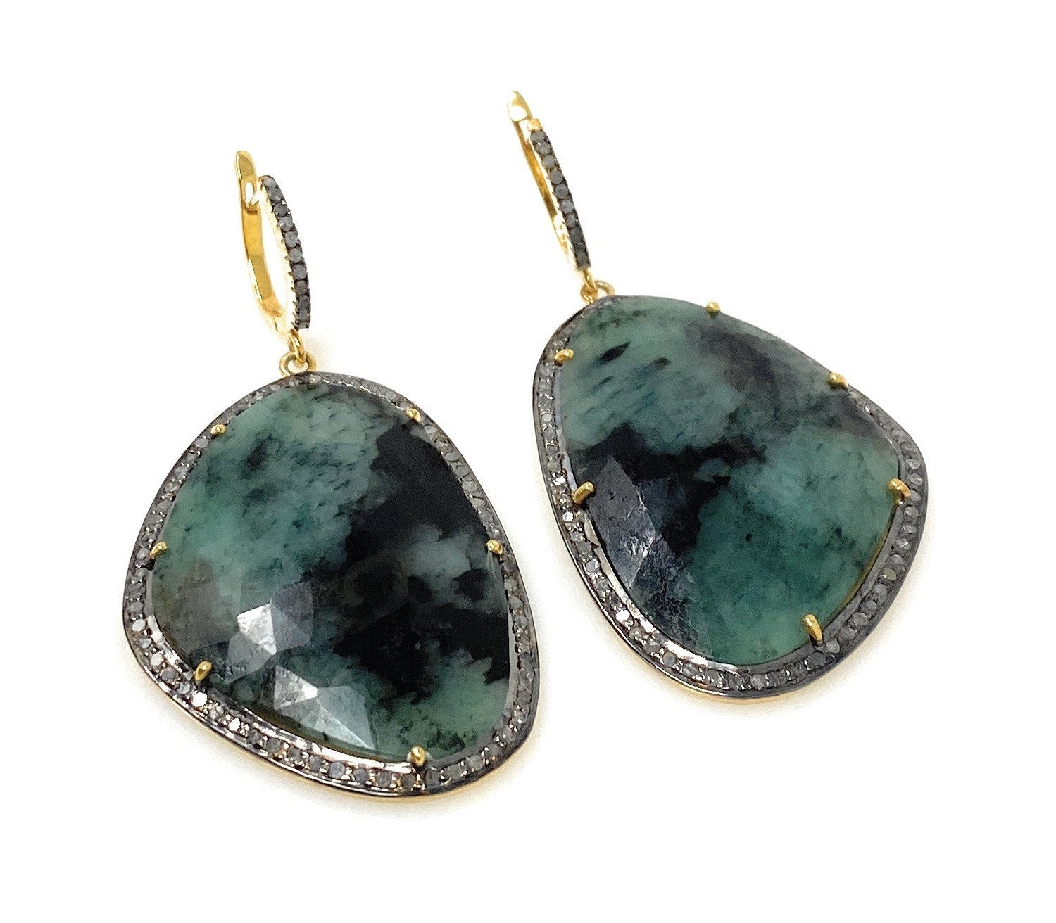 Genuine Emerald Pave Diamond Earrings, Natural Gemstone Earrings, Victorian Jewelry Gifts for Her