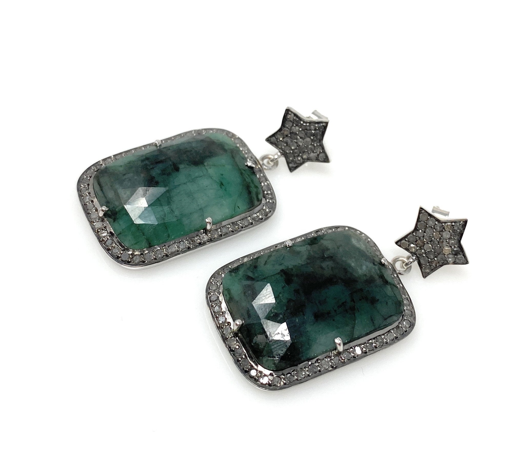 These beautiful Emerald Earrings are handmade with meticulous care using genuine diamonds bezel set in Grayish Black Rhuthenium over Sterling Silver.