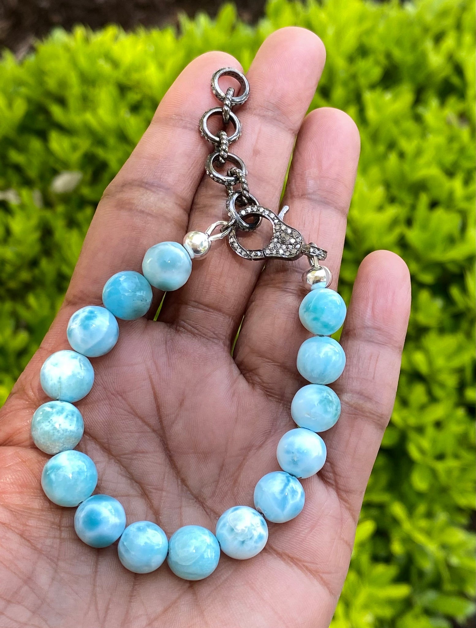 Genuine Larimar Gemstone Adjustable Pave Diamond Bracelet Jewelry.