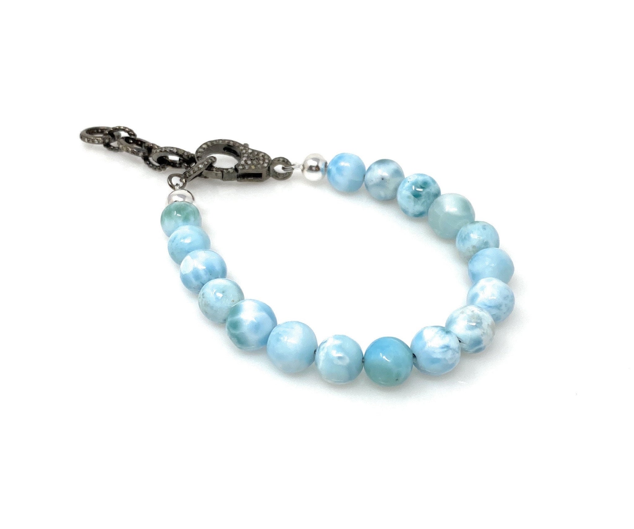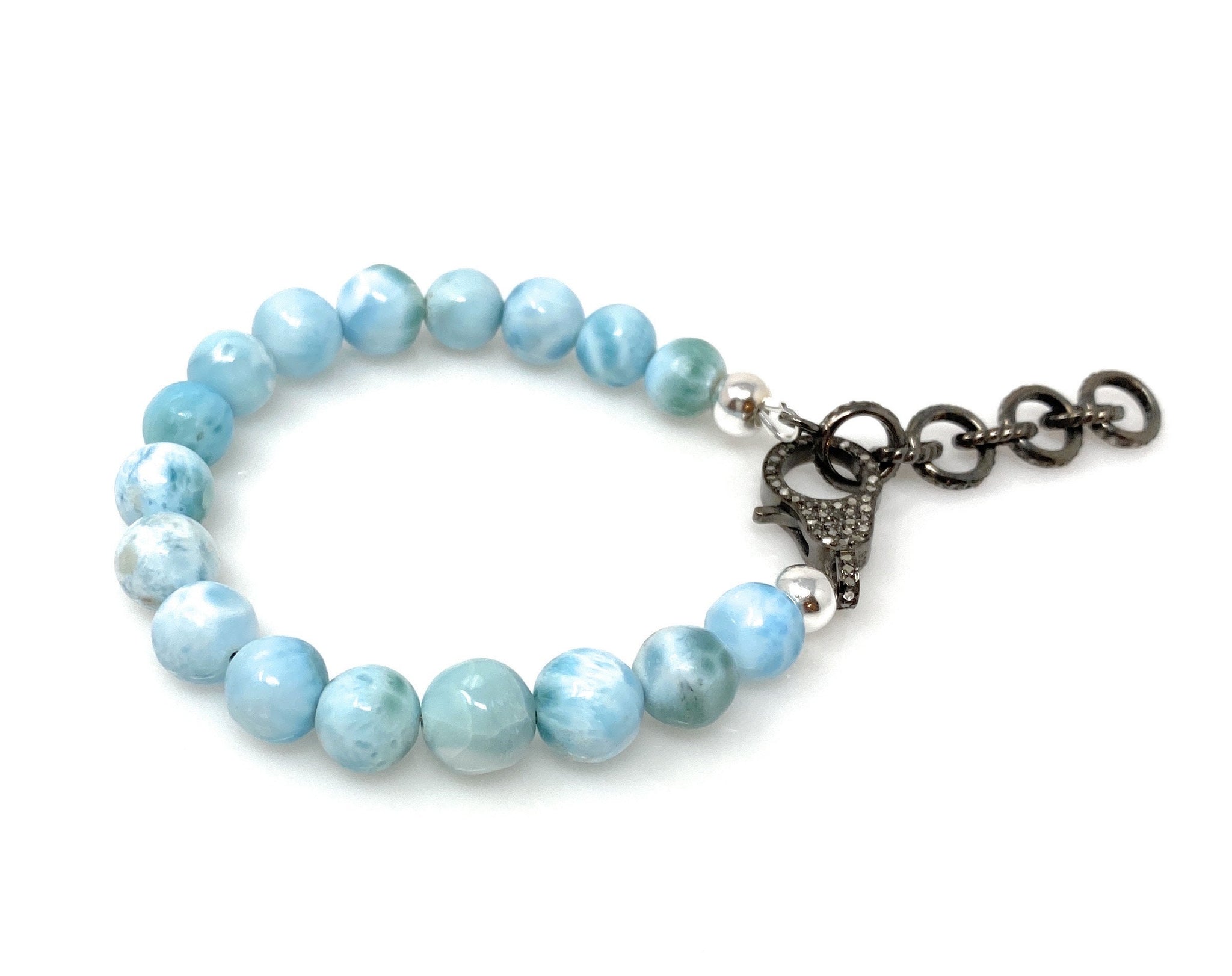 This beautiful Handmade Natural Larimar Gemstone Adjustable Bracelet is made with using Genuine Larimar Beads and Genuine Diamond Clasp with Diamond Extender Links to adjust the bracelet to desired size and is an excellent choice for any occasion and makes a great gift for the loved ones.