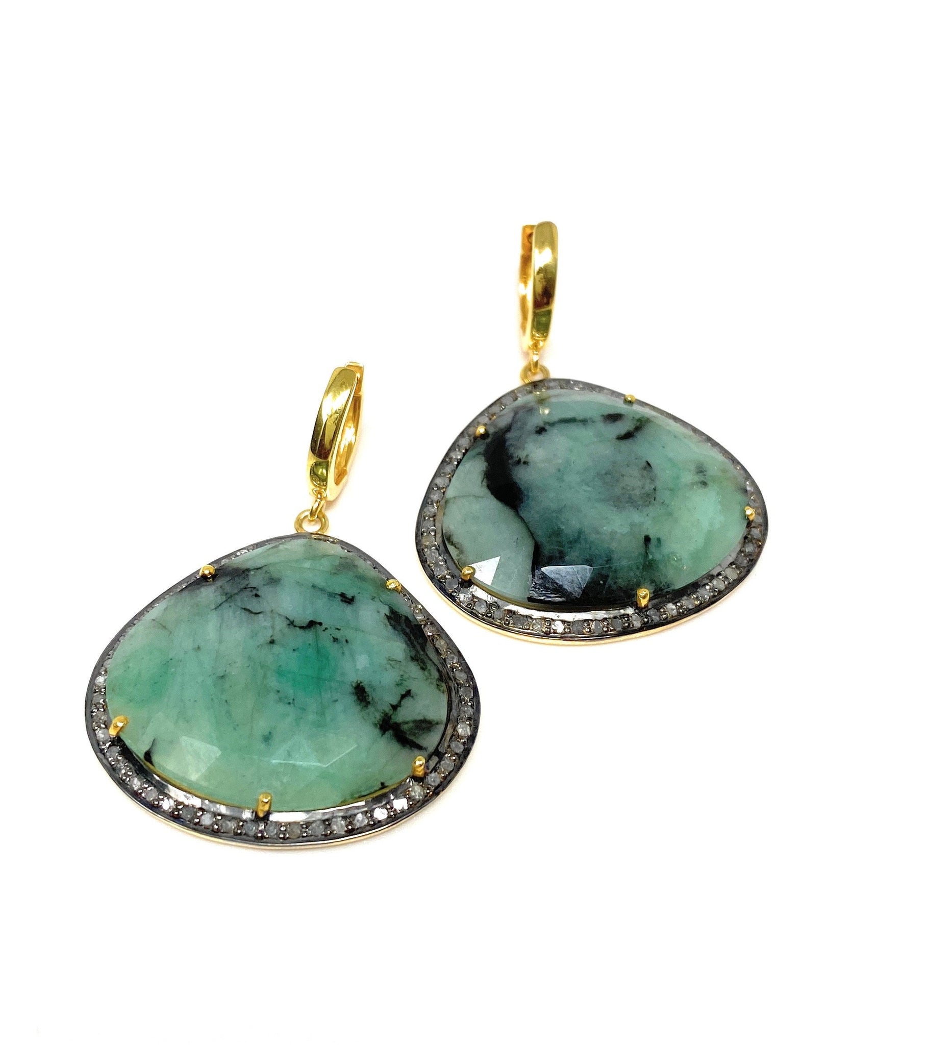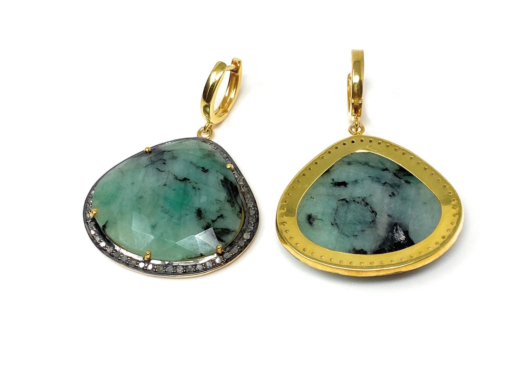 These beautiful Emerald Earrings are handmade with meticulous care using genuine diamonds and Natural Gemstone bezel set in Black Rhuthenium over Sterling Silver and 14K Gold Plated.
