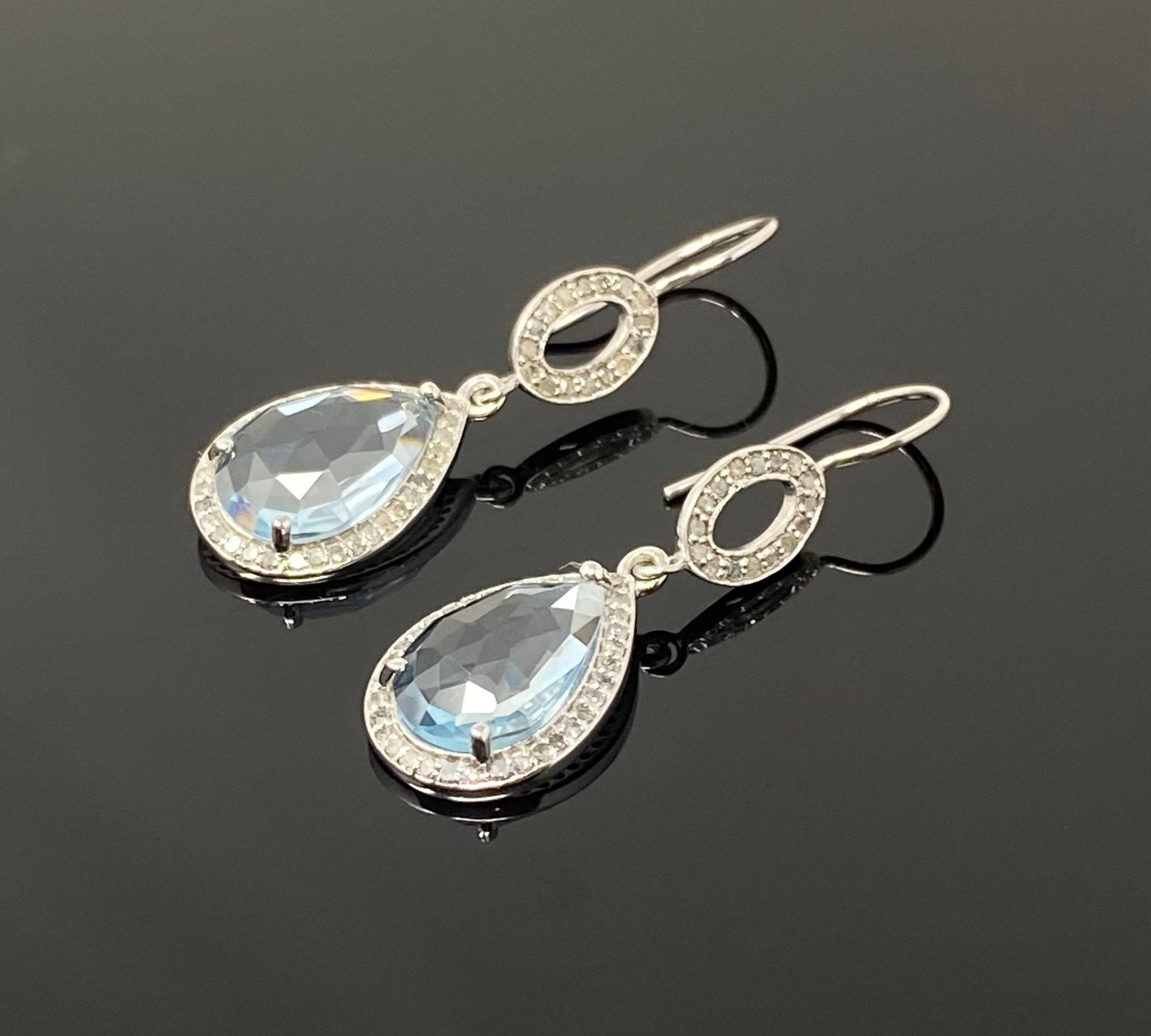 Genuine Sky Blue Topaz Pave Diamond Earrings, Sterling Silver Gemstone Earrings, Vintage Jewelry, 1.75”x 0.55”
