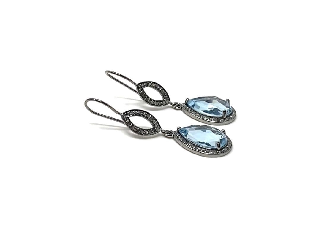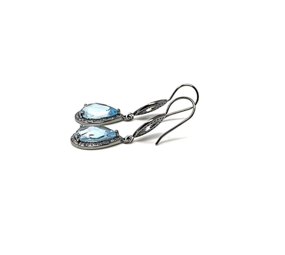 Genuine Sky Blue Topaz Pave Diamond Earrings, Black Rhuthenium over Sterling Silver Gemstone Earrings, Vintage Jewelry, 1.85” x 0.55”