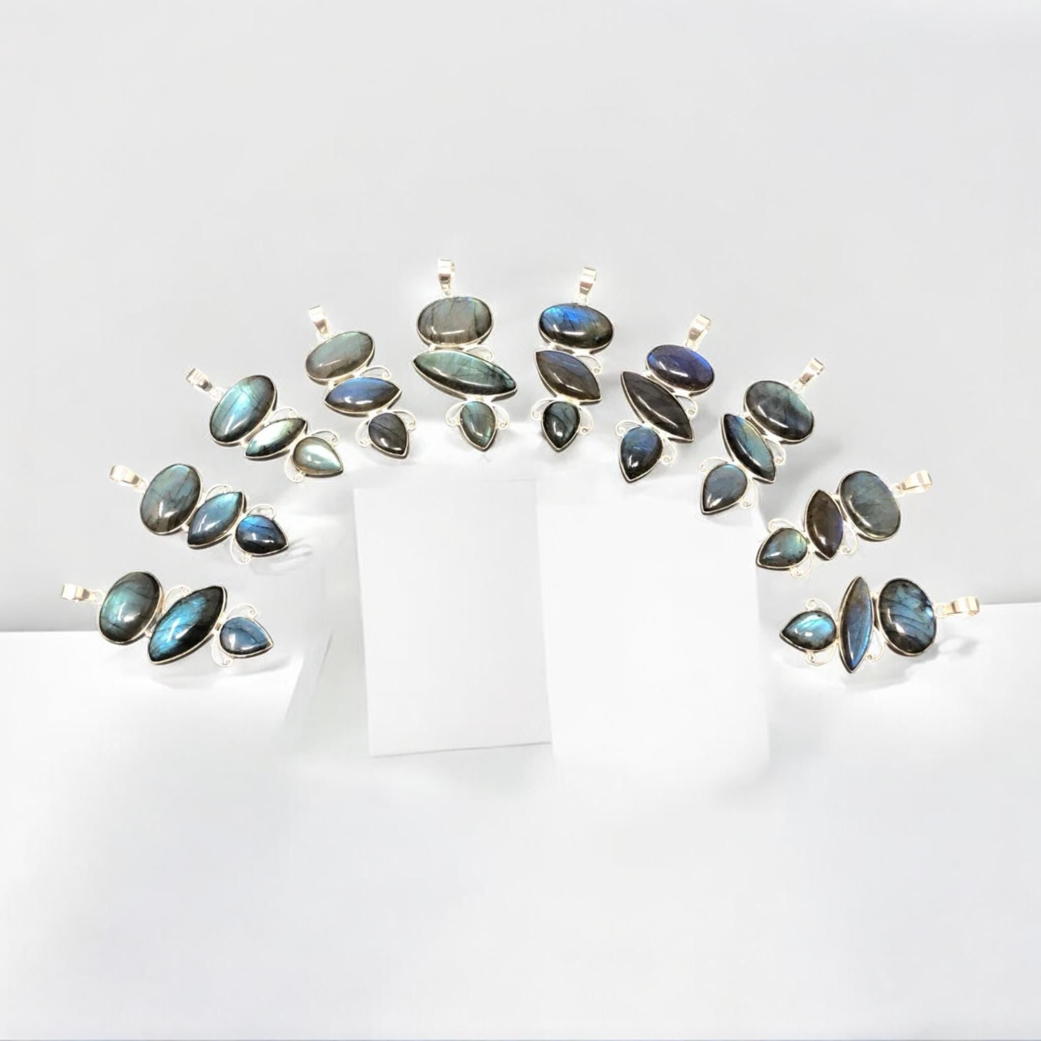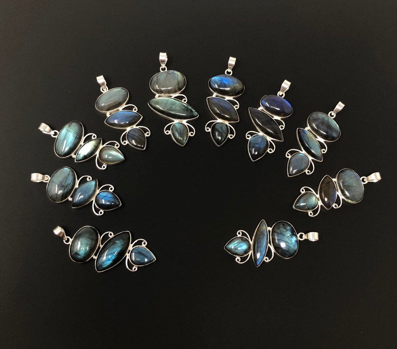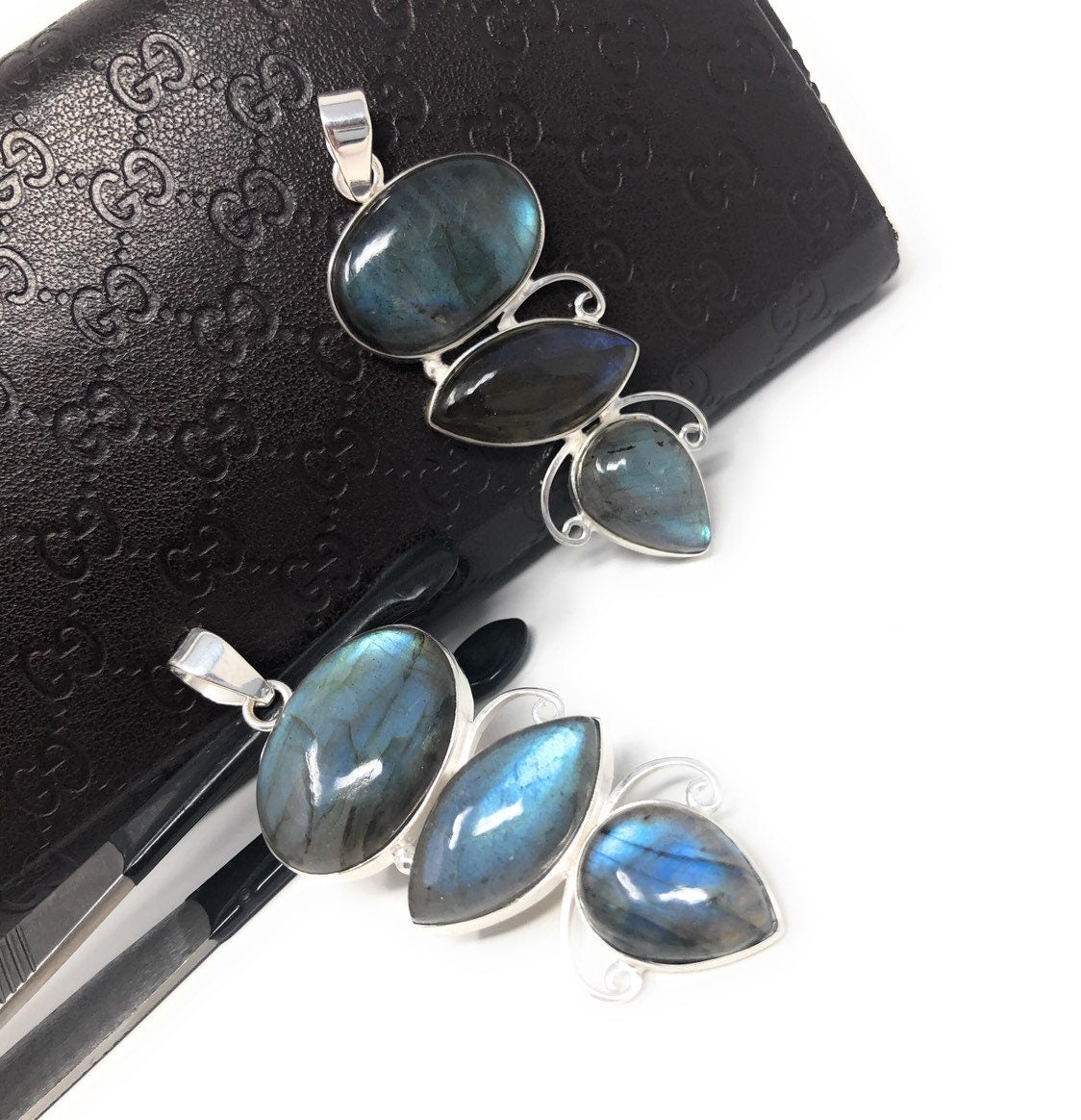 This beautiful Handmade Natural Labradorite Blue and Green Flash 925 Sterling Silver Pendant is made with using 3 different shapes of Labradorite Cabochon and bezel set in designer pattern in Sterling silver in wire wrapped design.