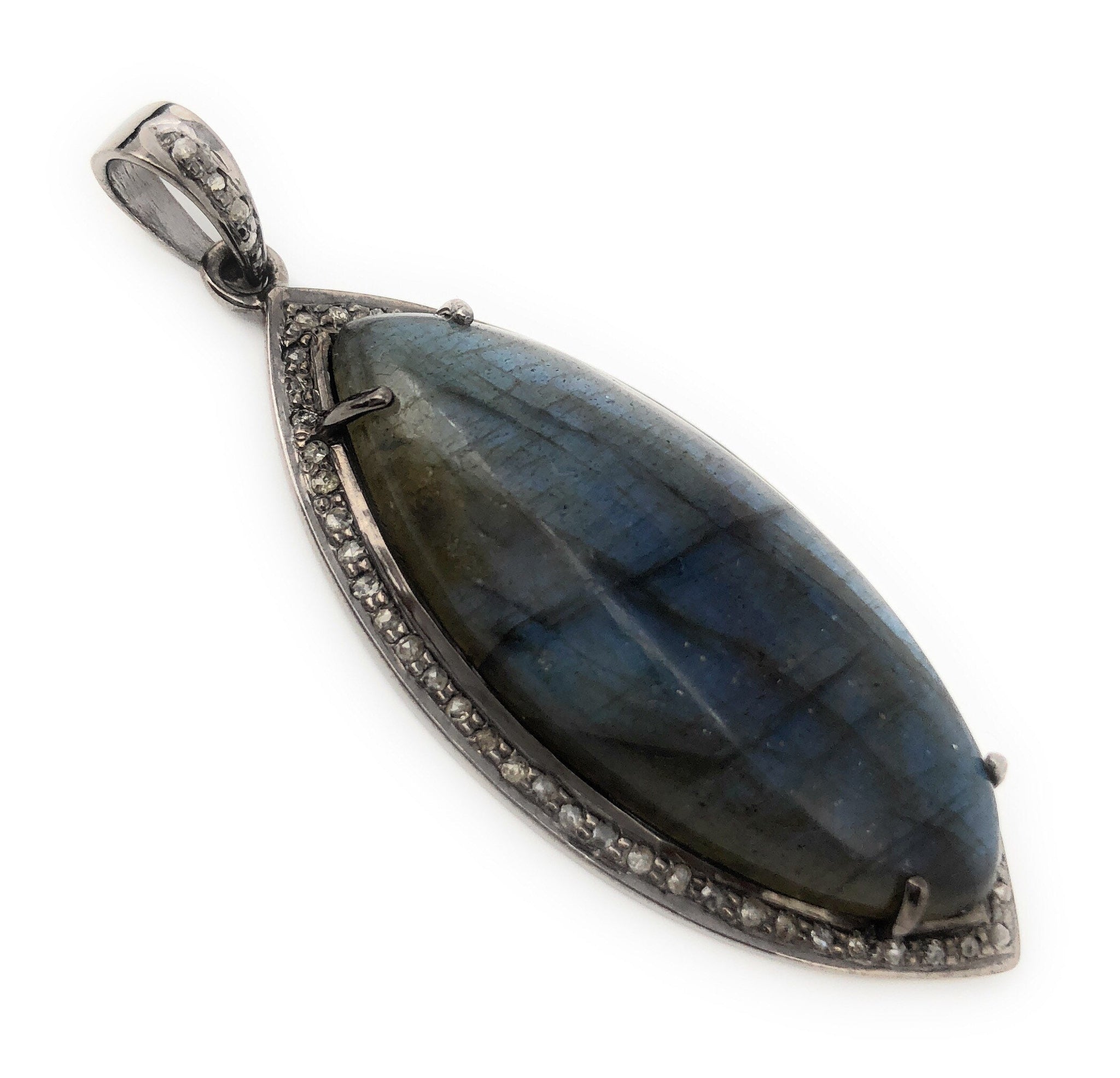 Sterling Silver Natural Labradorite Gemstone Pave Diamond Pendant.