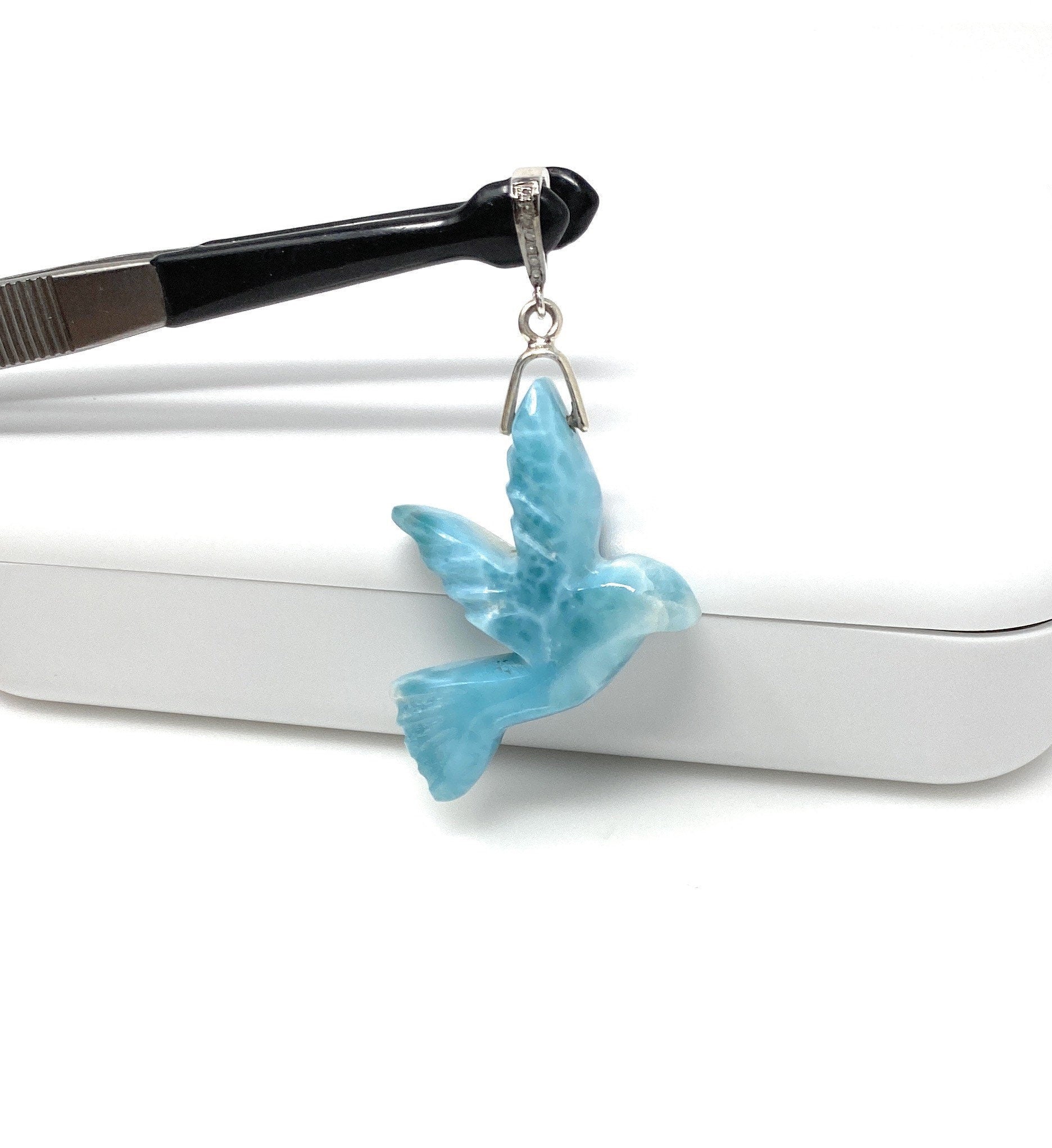 Treat yourself or a loved one to the healing power of Larimar. This special gemstone is ideal for meditation, yoga, or any moment you need to reconnect with your true self and the natural world around you. This beautiful Handmade AAA Grade Natural Hand Carved Larimar Silver Pendant with Pave Diamond Bail in Black Gray Ruthenium in the front around the diamonds over Sterling Silver is an excellent choice for any occasion and makes a great gift for the loved ones.