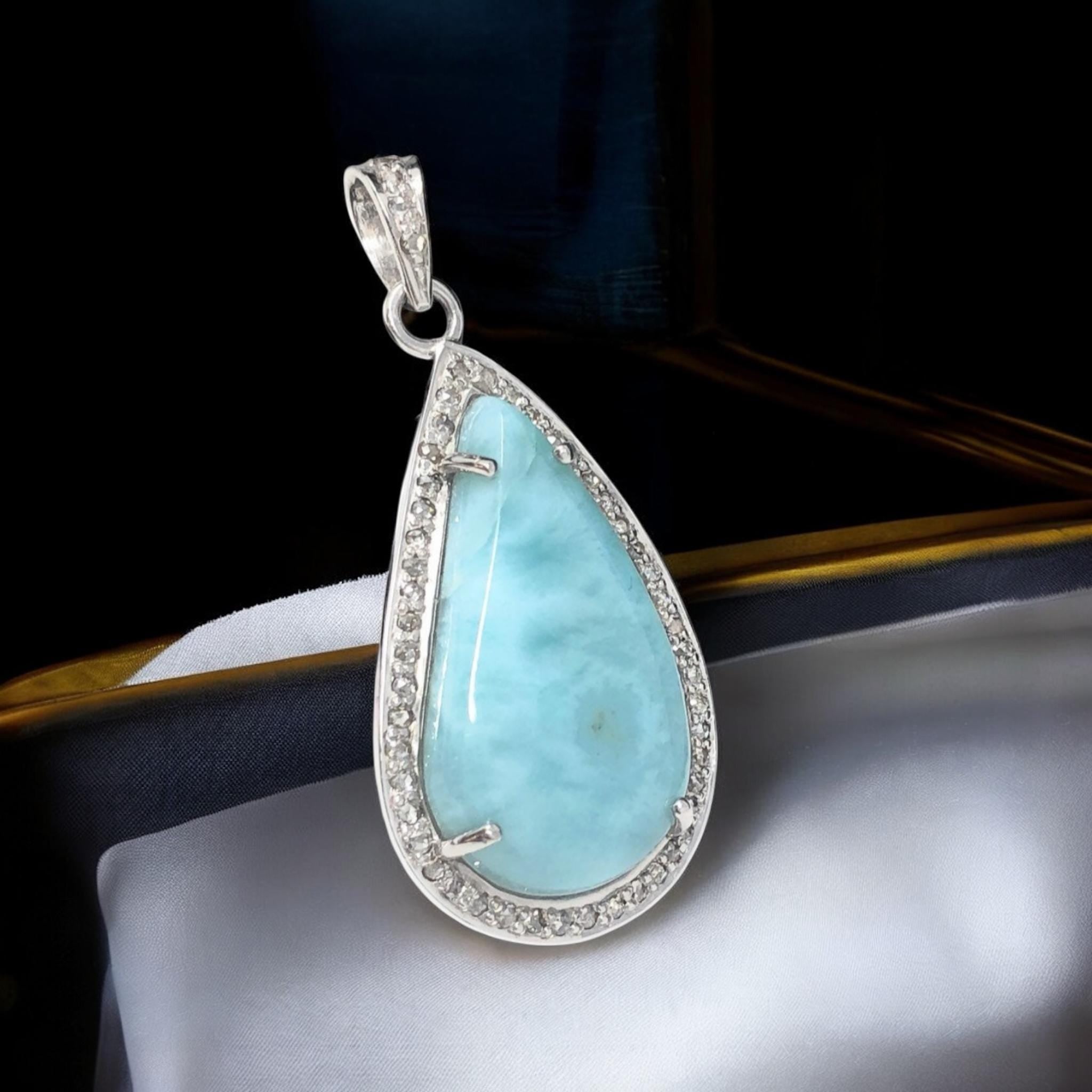Sterling Silver Natural Larimar Gemstone Pave Diamond Handmade Pendant.