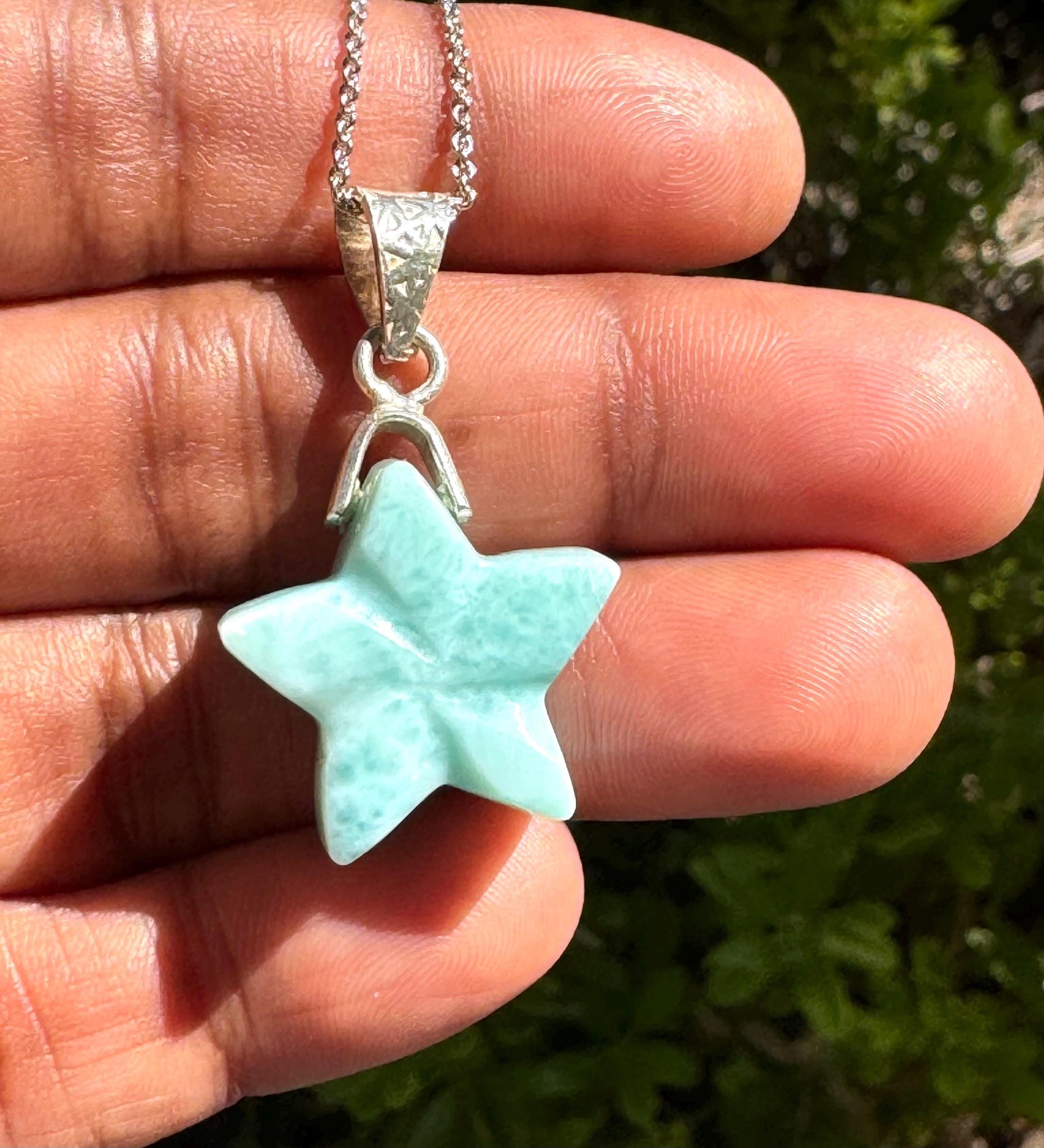 Larimar Gemstone Necklace, Hand Carved Larimar Star Necklace, Bohemian Jewelry, Dominican Republic Larimar Necklace, 1.30”x 0.75”