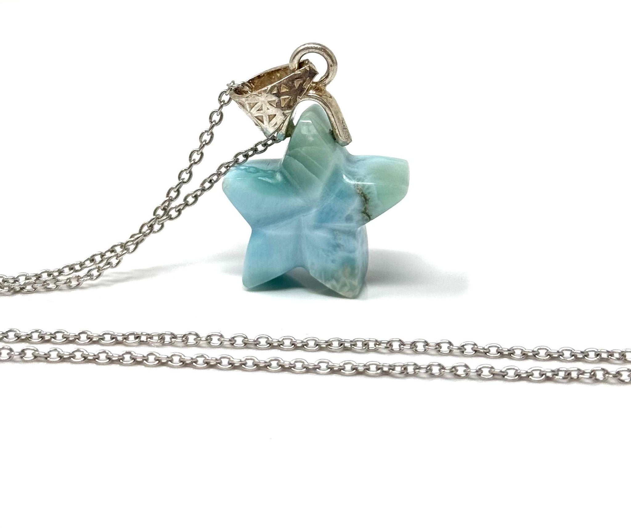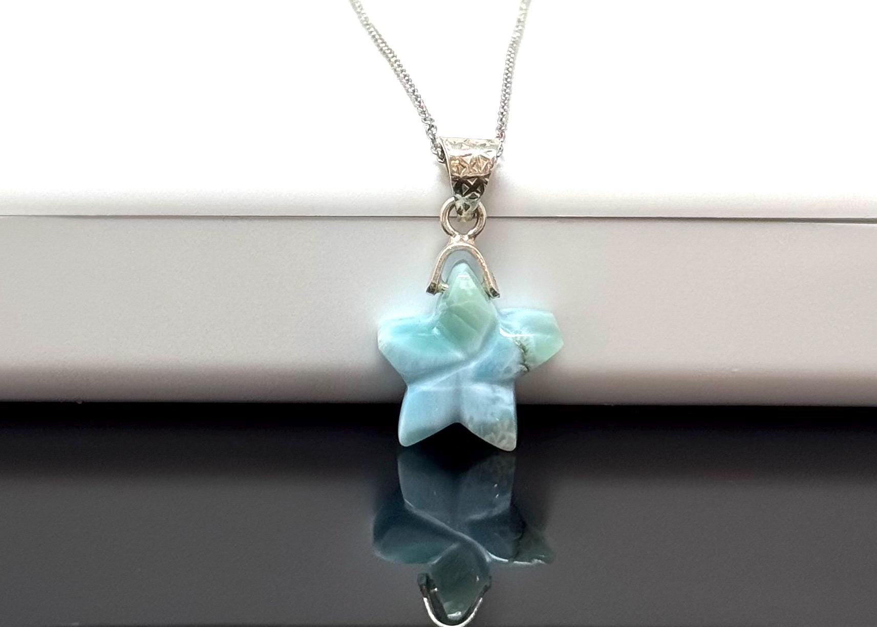 Larimar Gemstone Necklace, Hand Carved Larimar Star Necklace, Bohemian Jewelry Gifts, Dominican Republic Larimar Necklace, 1.30” x 0.80”