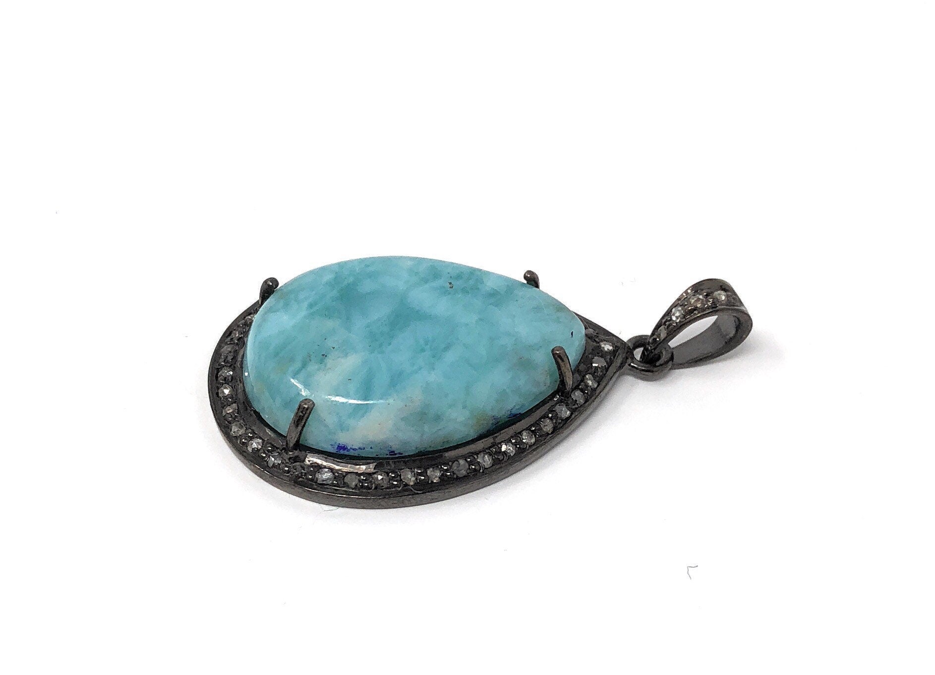 This beautiful Handmade AAA+ Grade Natural Larimar Gemstone Pear/Drop Shape Oxidized 925 Sterling Silver Large Pave Diamond Bezel Setting Bohemian Pendant is an excellent choice for any occasion and makes a great gift for the loved ones.