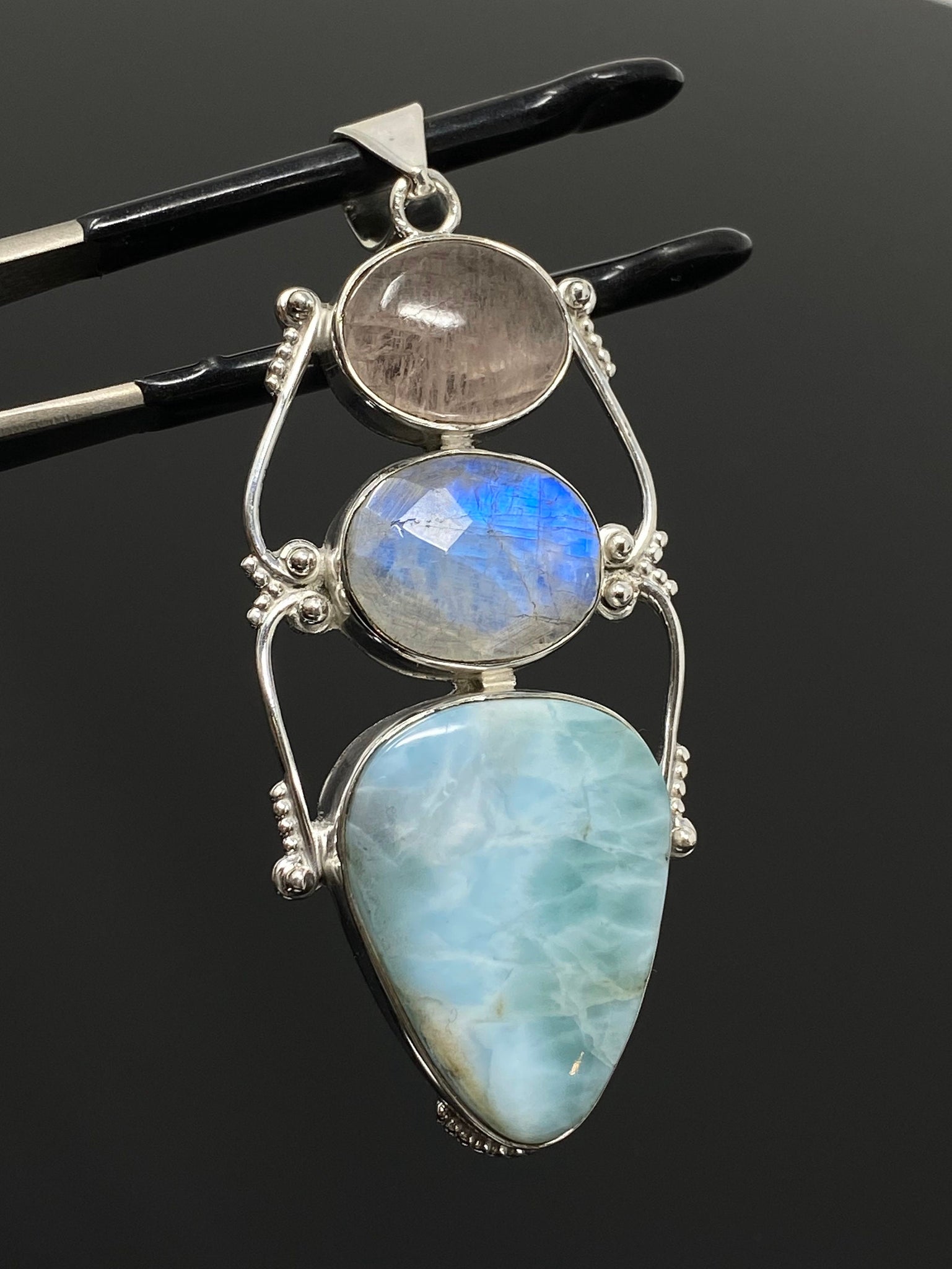 Larimar with Blue Flash Moonstone and Morganite Gemstone Sterling Silver Pendant Jewelry at Wholesale Price.