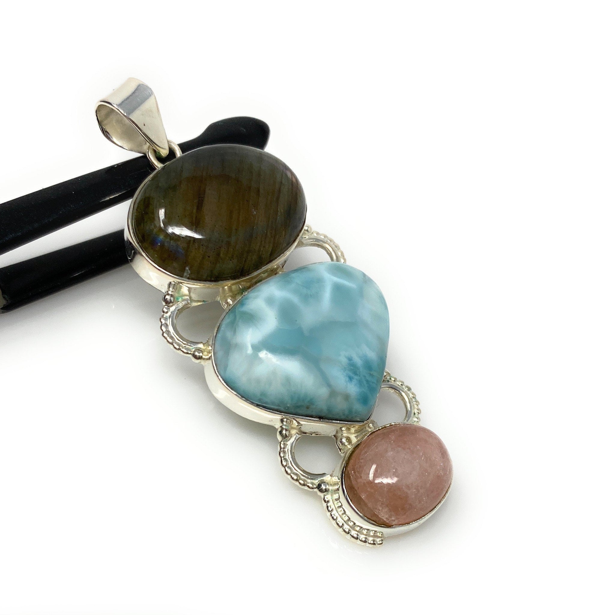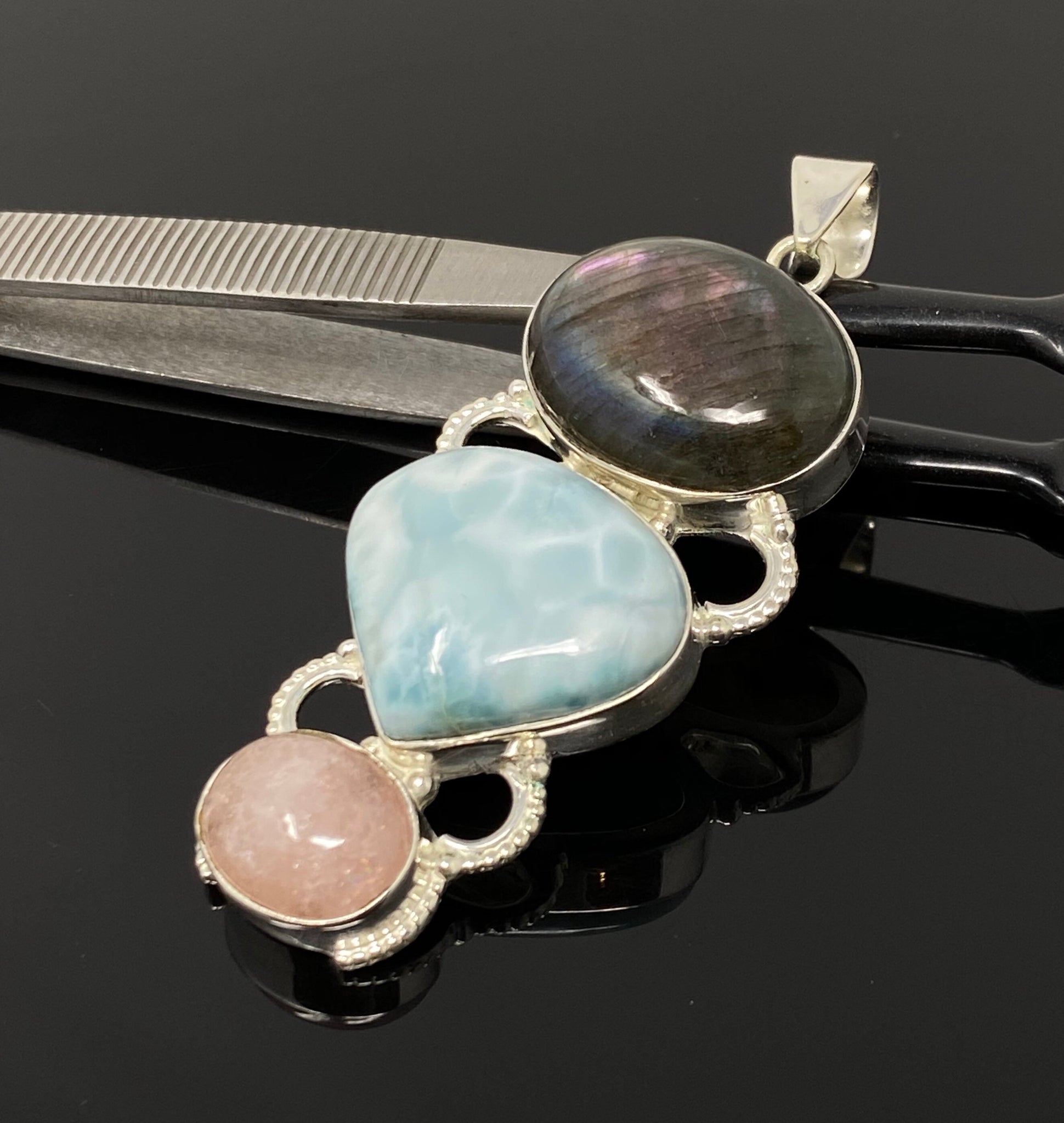 Larimar, Purple Flash Labradorite and Morganite Gemstone Sterling Silver Pendant Jewelry at Wholesale Price.