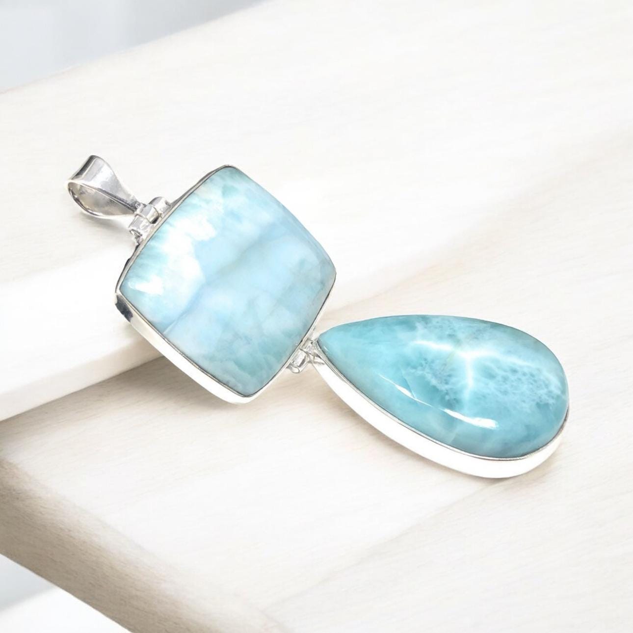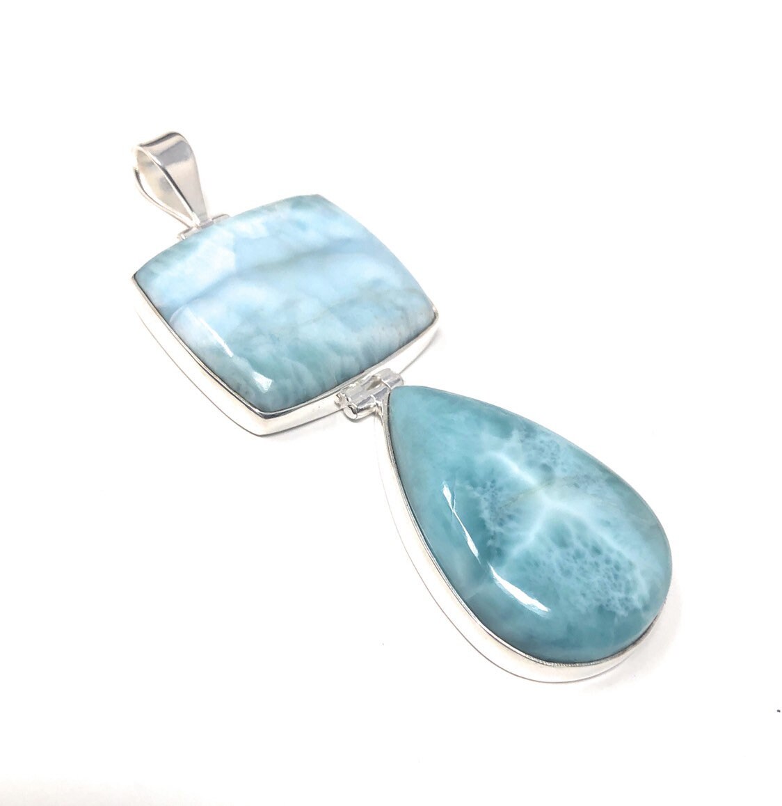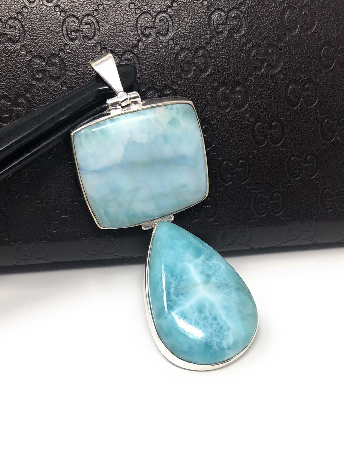 This beautiful Handmade AAA Grade Natural Larimar Gemstone 925 Sterling Silver Large Pendant is made with exclusive design by attaching two pieces of Larimar Gemstone using a hinge pattern to give the pendant flexibility and is an excellent choice for any occasion and makes a great gift for the loved ones.