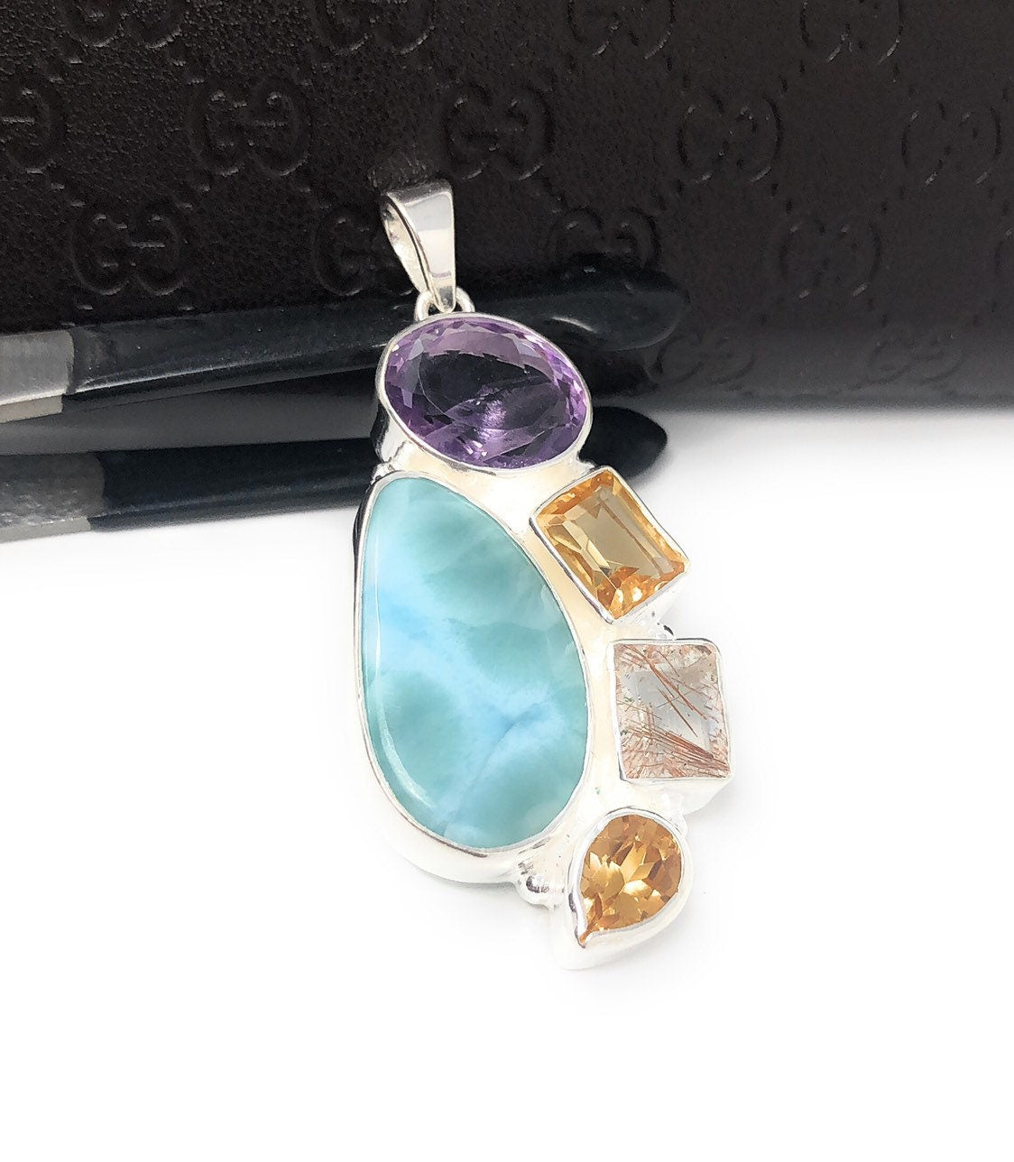 This Beautiful Handmade 925 Sterling Silver Designer Large Pendant is made with using Larimar, Citrine , Golden Rutile and Amethyst and is an excellent choice for any occasion and makes a great gift for the loved ones.