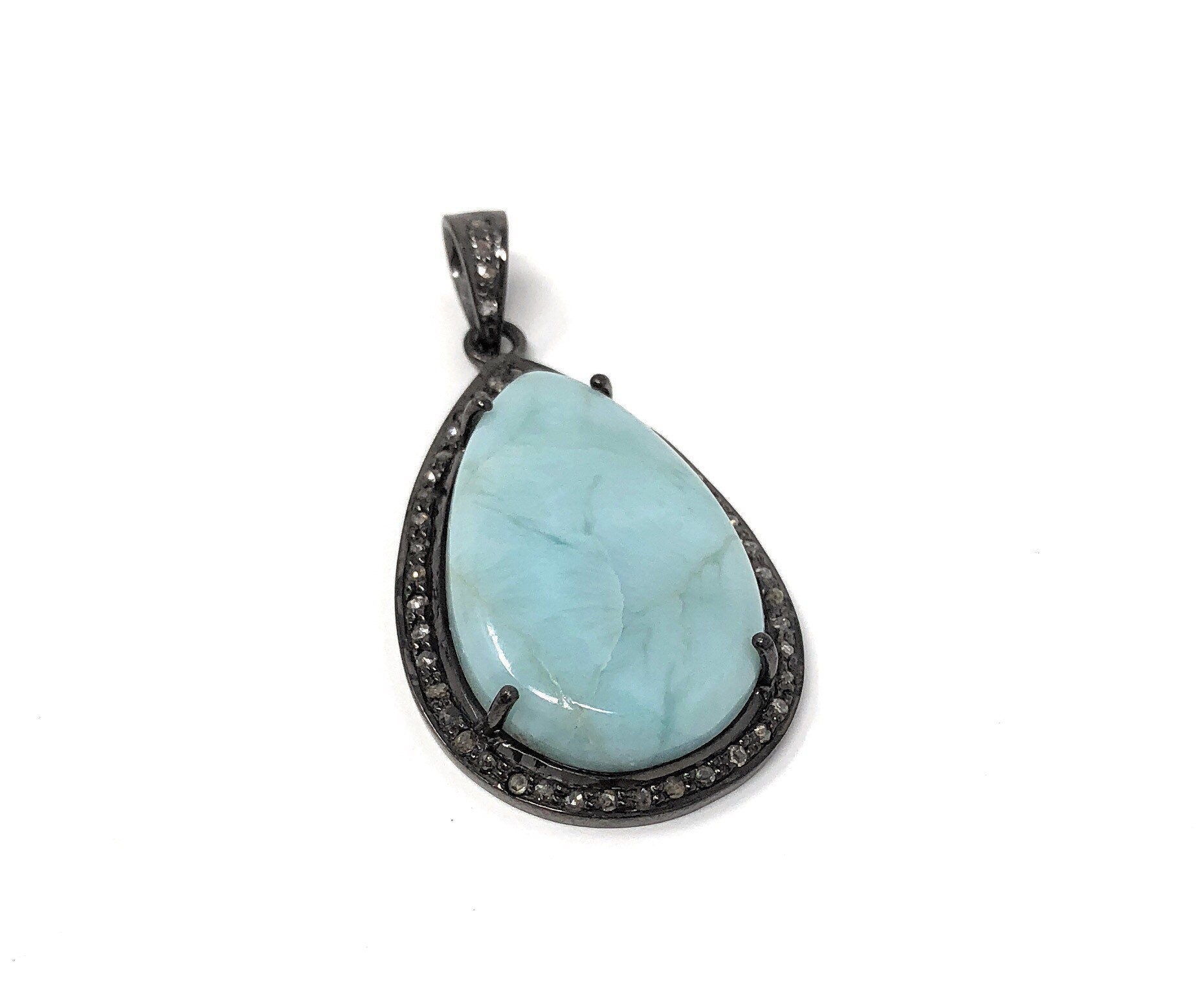 This beautiful Handmade AAA+ Grade Natural Larimar Gemstone Pear/Drop Shape Oxidized 925 Sterling Silver Large Pave Diamond Bezel Setting Pendant is an excellent choice for any occasion and makes a great gift for the loved ones.