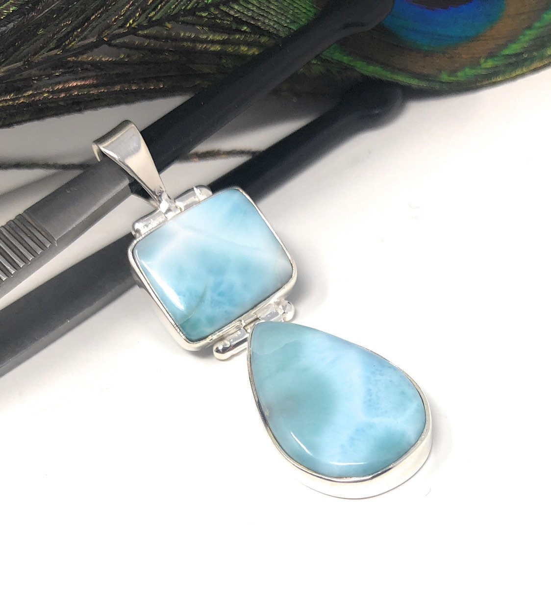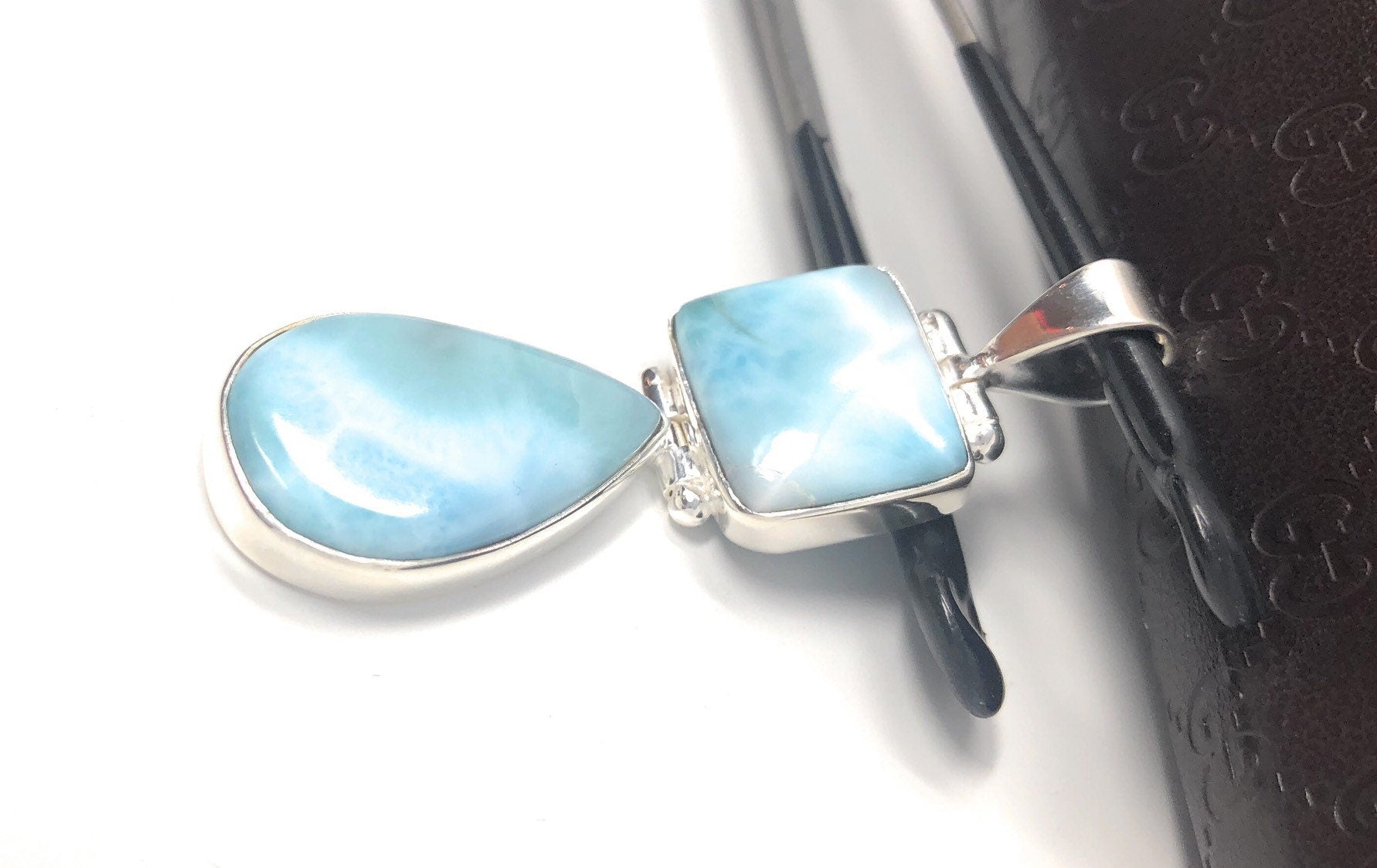 This beautiful Handmade AAA Grade Natural Larimar Gemstone 925 Sterling Silver Large Pendant is made with exclusive design by attaching two pieces of Larimar Gemstone using a hinge pattern to give the pendant flexibility and is an excellent choice for any occasion and makes a great gift for the loved ones.