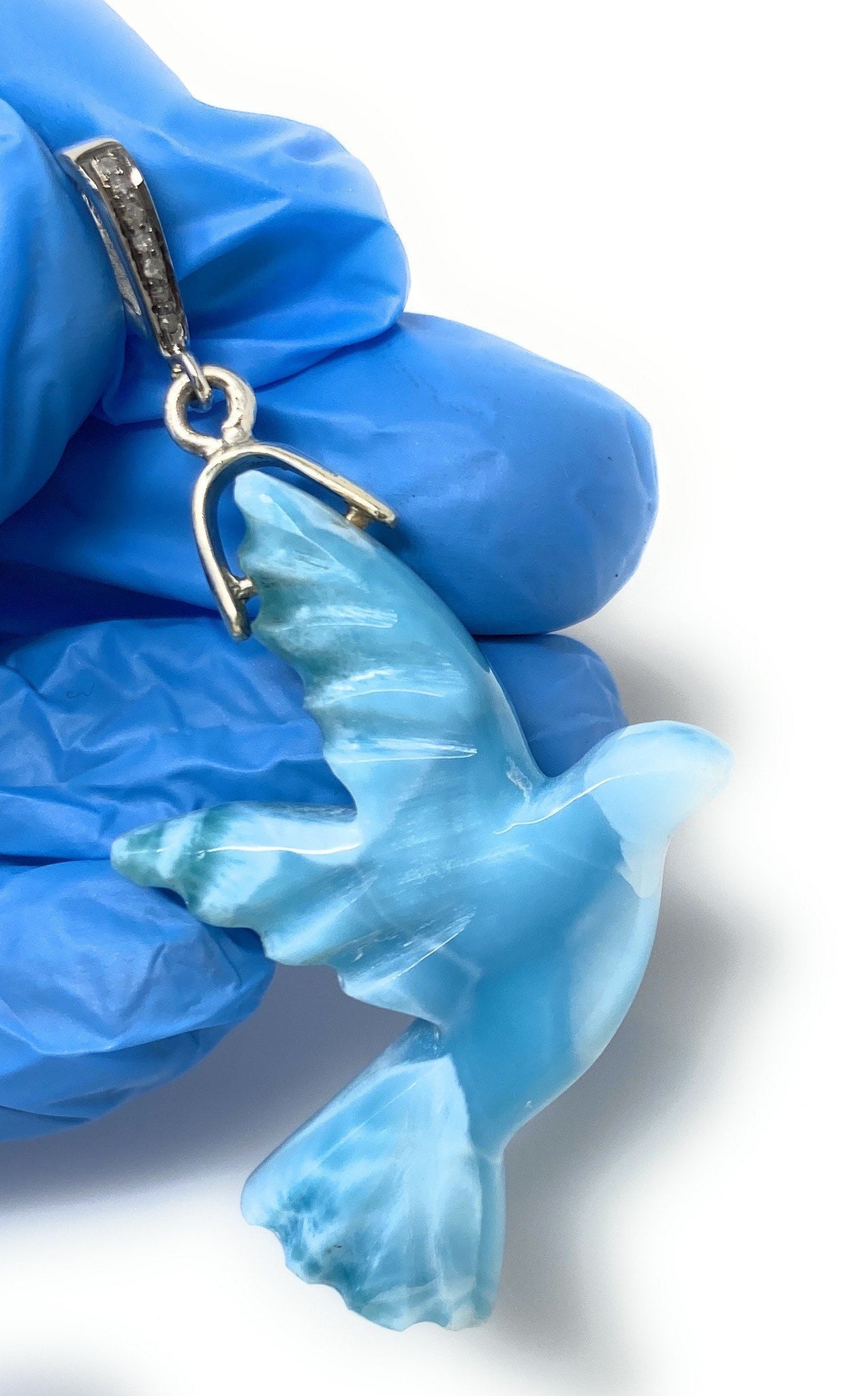 Larimar Pendant, Silver Larimar Bird Pendant, Pave Diamond Gemstone Pendant, Spiritual Healing Chakra Crystal Jewelry, Meditation Jewelry