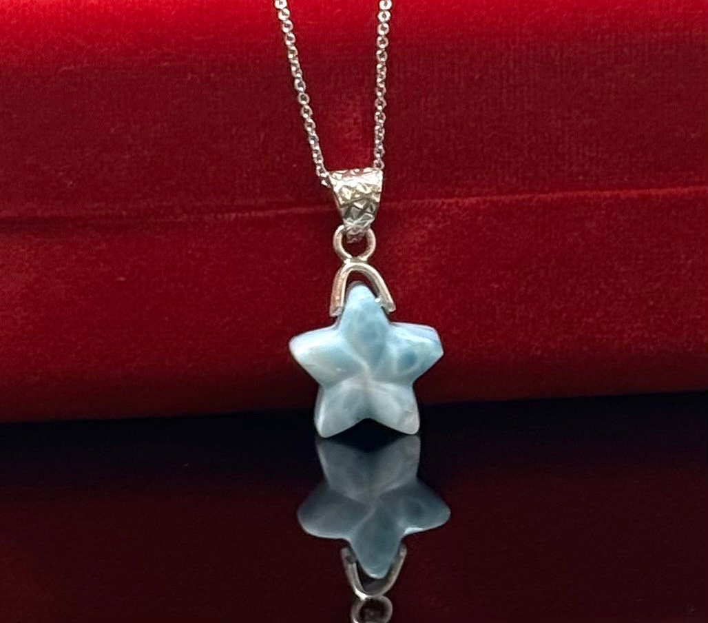 Larimar Star Necklace , Sterling Silver Hand Carved Larimar Pendant Necklace, Bohemian Jewelry, Natural Dominican Republic Larimar Pendant