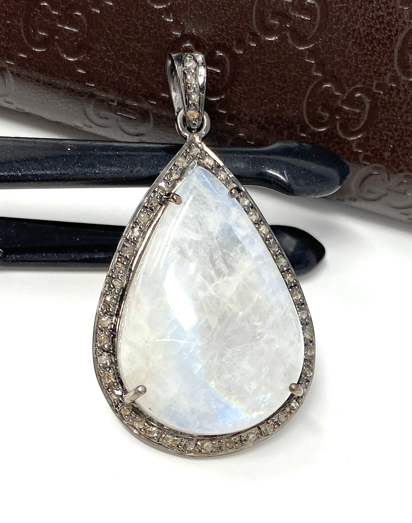 This exclusive beautiful Handmade AAA+ Grade Large Natural Rainbow Moonstone Gemstone Drop Shape Oxidized 925 Sterling Silver Pave Diamond Bezel Setting Pendant is an excellent choice for any occasion and makes a great gift for the loved ones.
