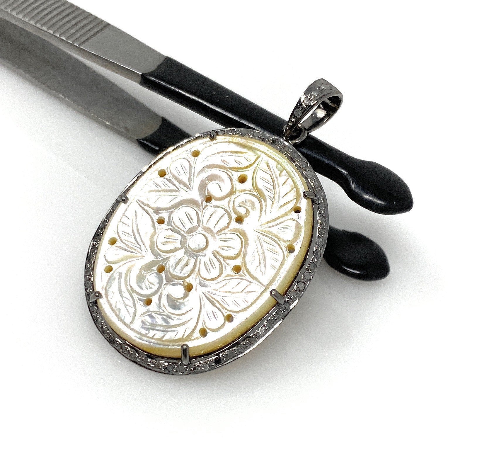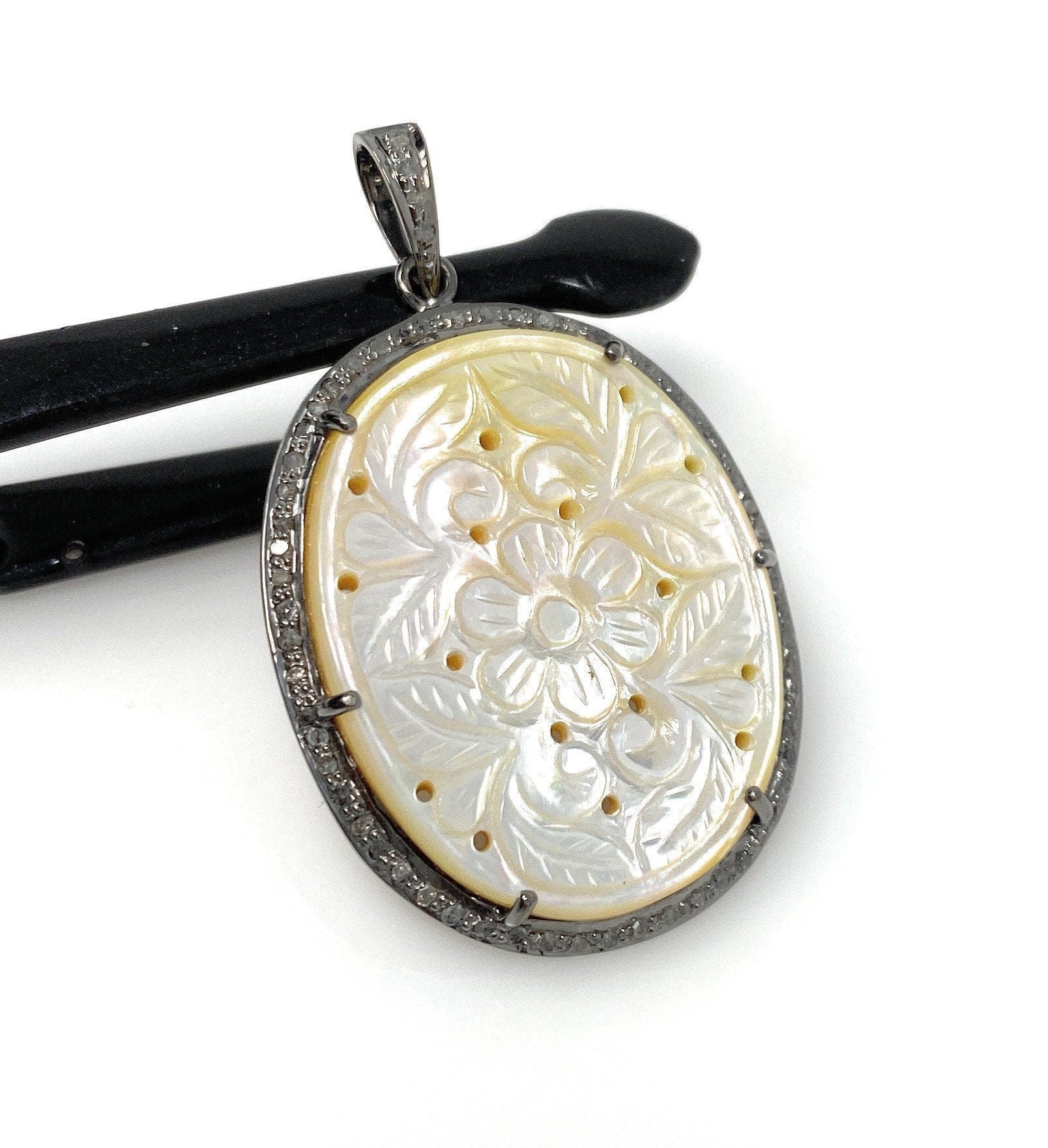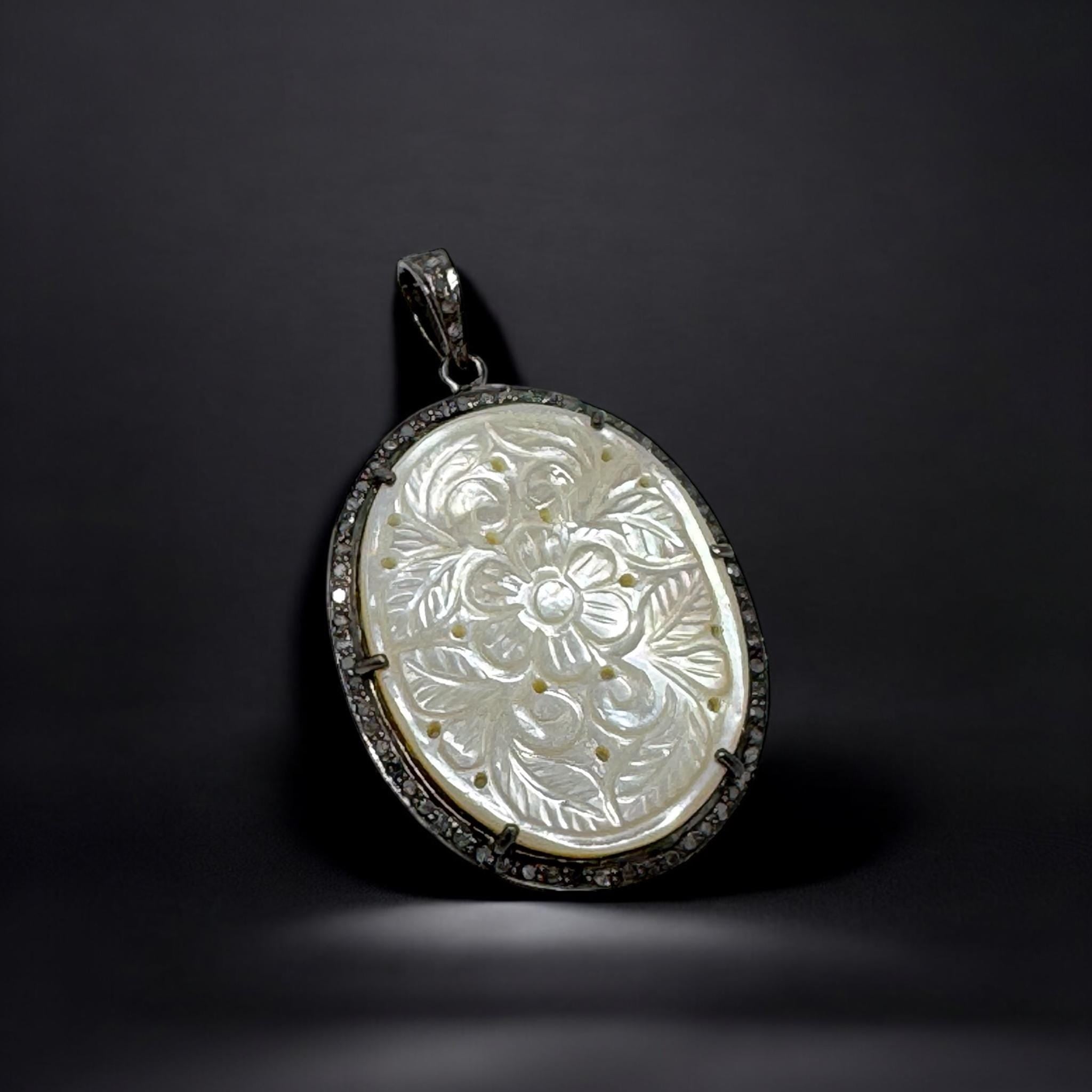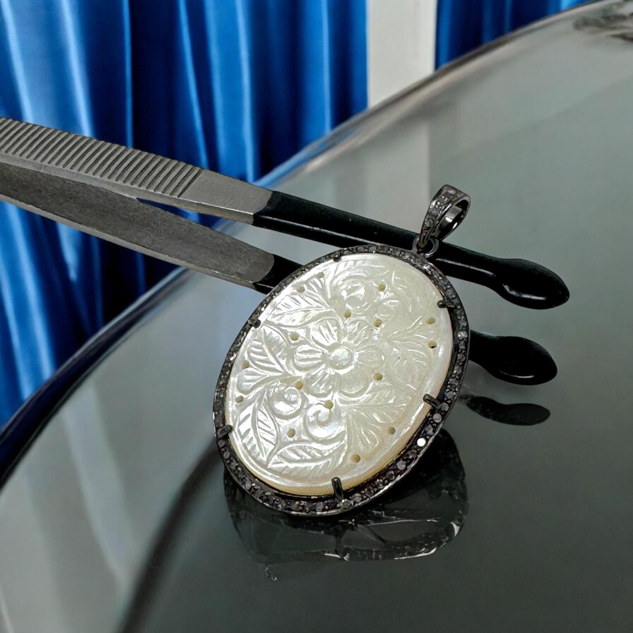 Natural Mother of Pearl Pave Diamond Sterling Silver Hand Carved Exclusive Pendant at Wholesale Price.
