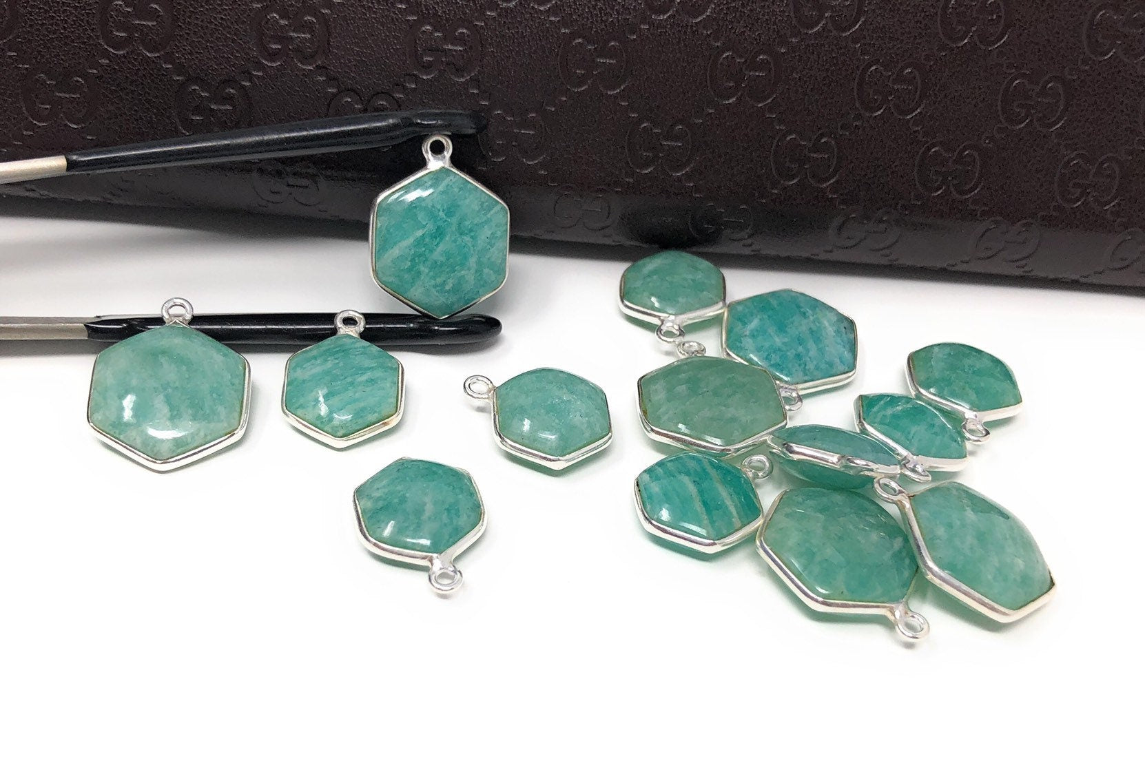 Sterling Silver Natural Gemstone Amazonite Bezel Set Double Sided Briolette Charm Jewelry Findings for Jewelry Making at Wholesale Price.
