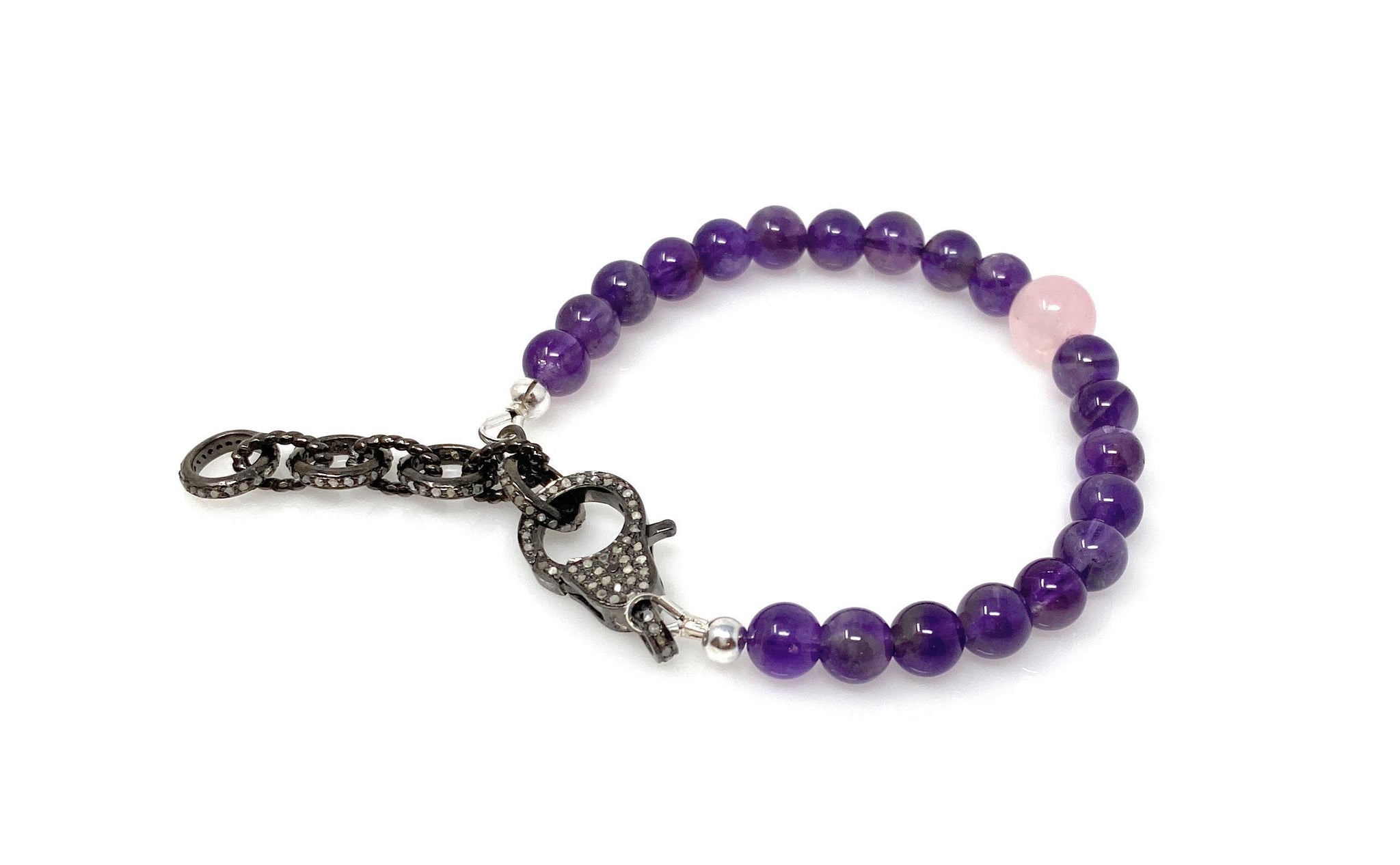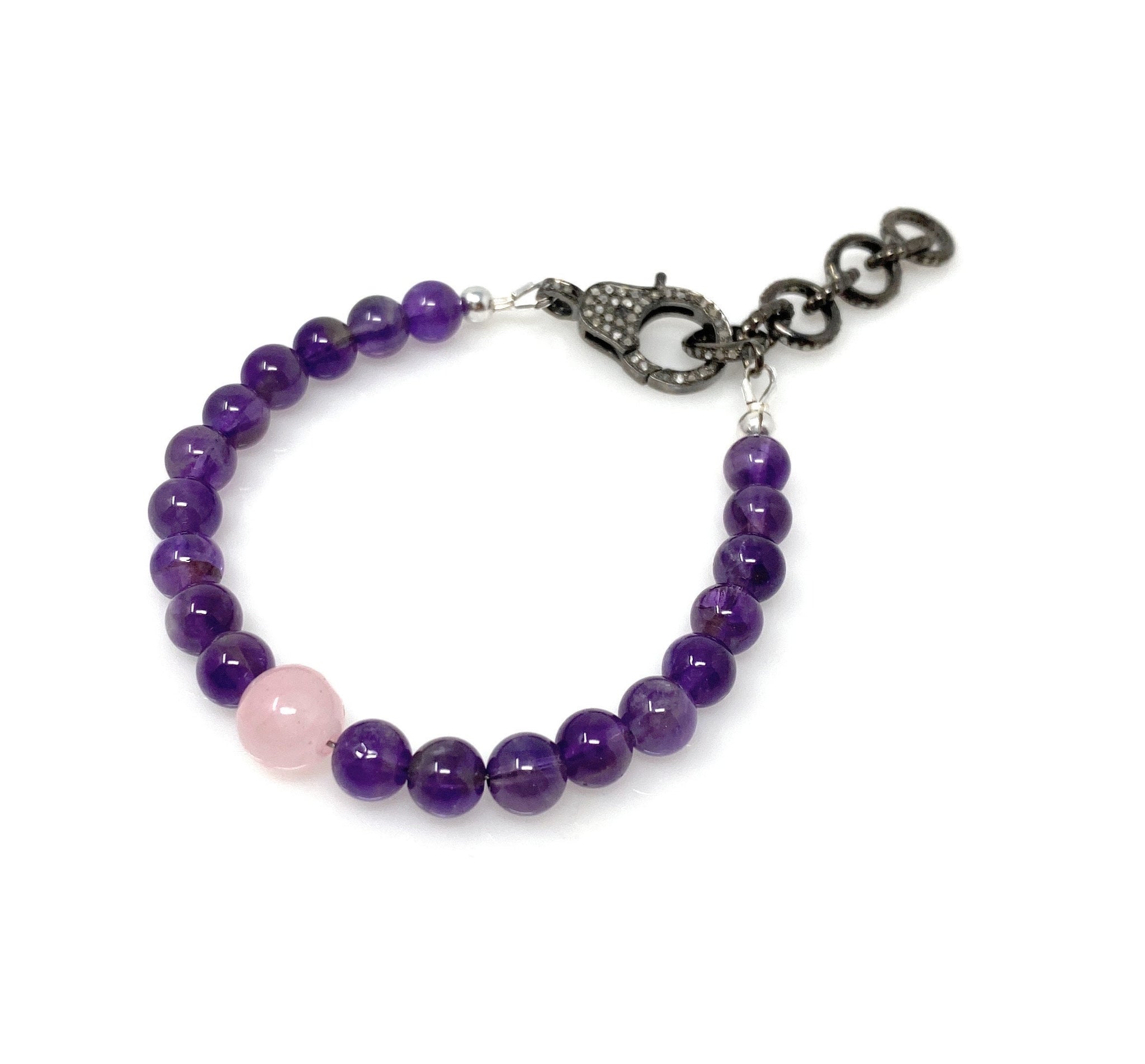 GEMSTONE : NATURAL ROSE QUARTZ, AMETHYST AND GENUINE DIAMONDS ( On Clasp and Extender Rings)