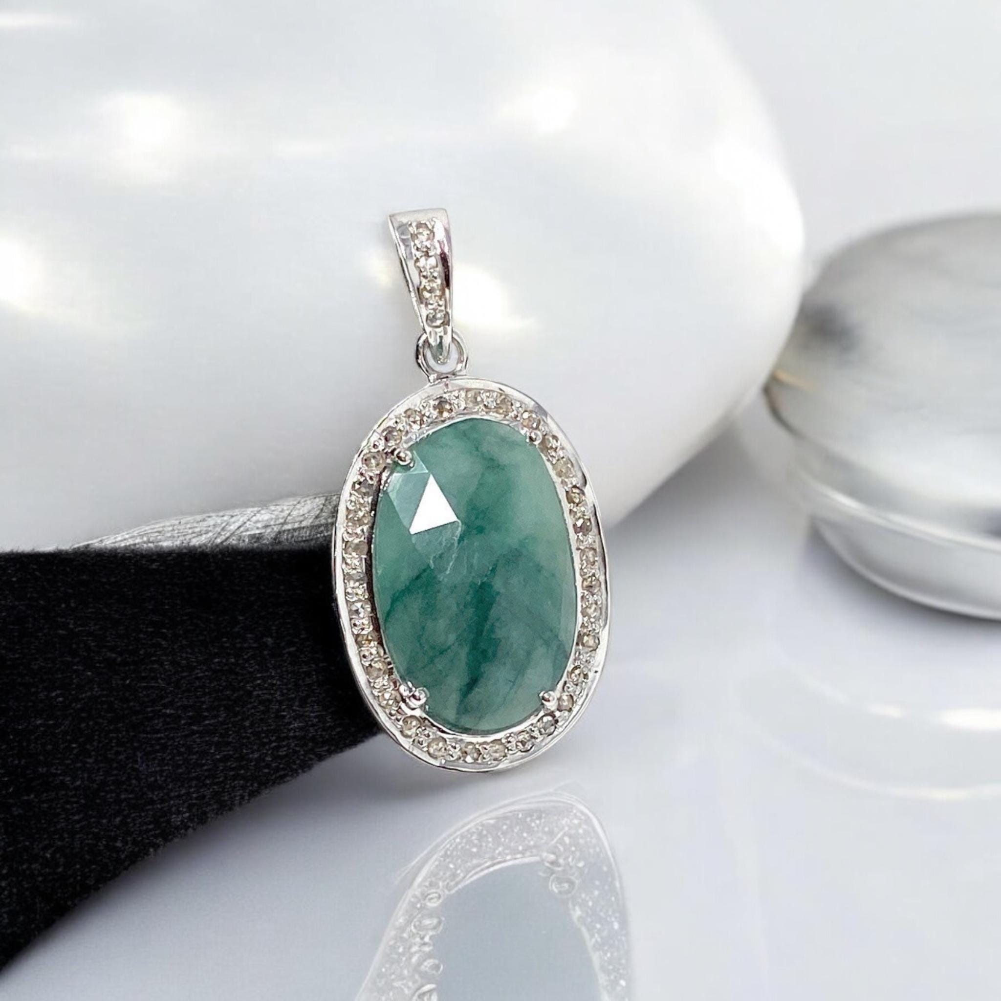 Natural Genuine Rose Cut Sakota Emerald Sterling Silver Diamond Pendant.