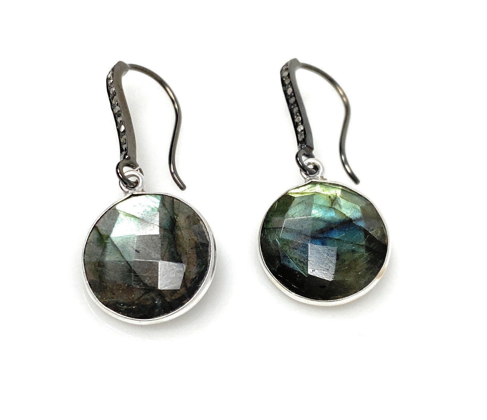 These beautiful Earrings are made with meticulous care using genuine diamonds on Black Rhodium Sterling Silver ear wires and Natural Faceted Labradorite bezel set in Sterling Silver.