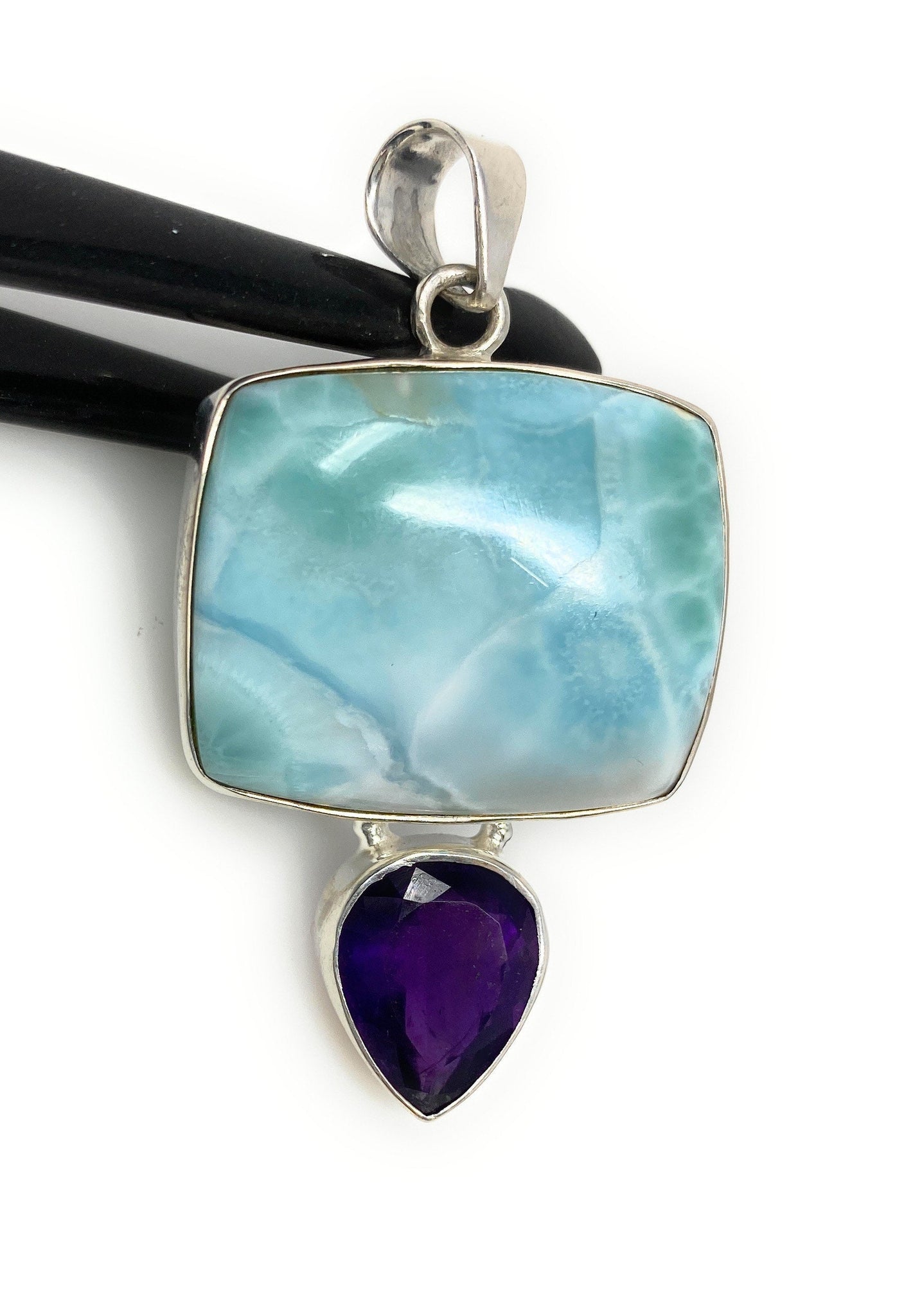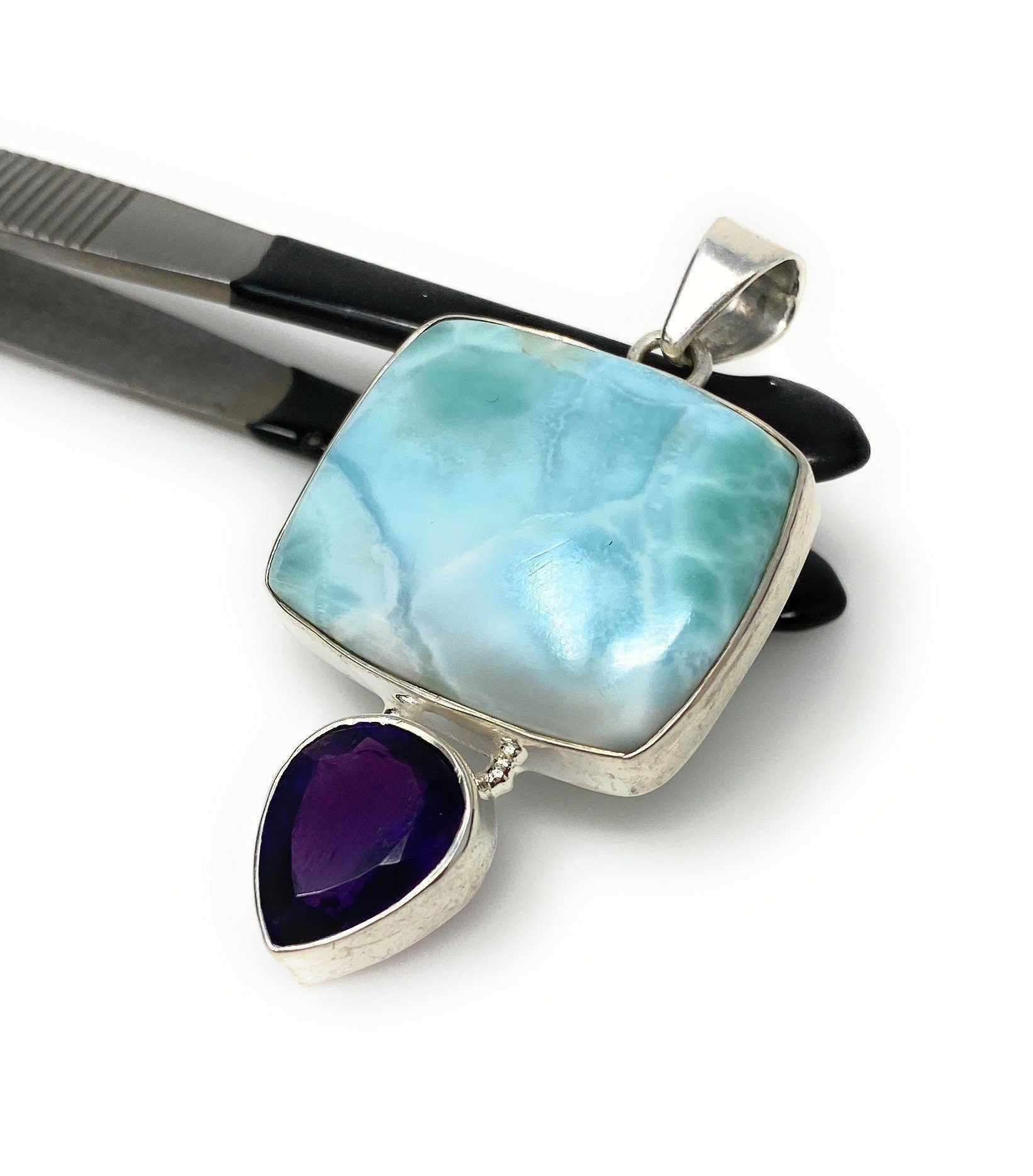 Natural Larimar and Amethyst Gemstone Pendant, Sterling Silver Jewelry, Larimar Pendant, Amethyst Pendant, Bohemian Jewelry