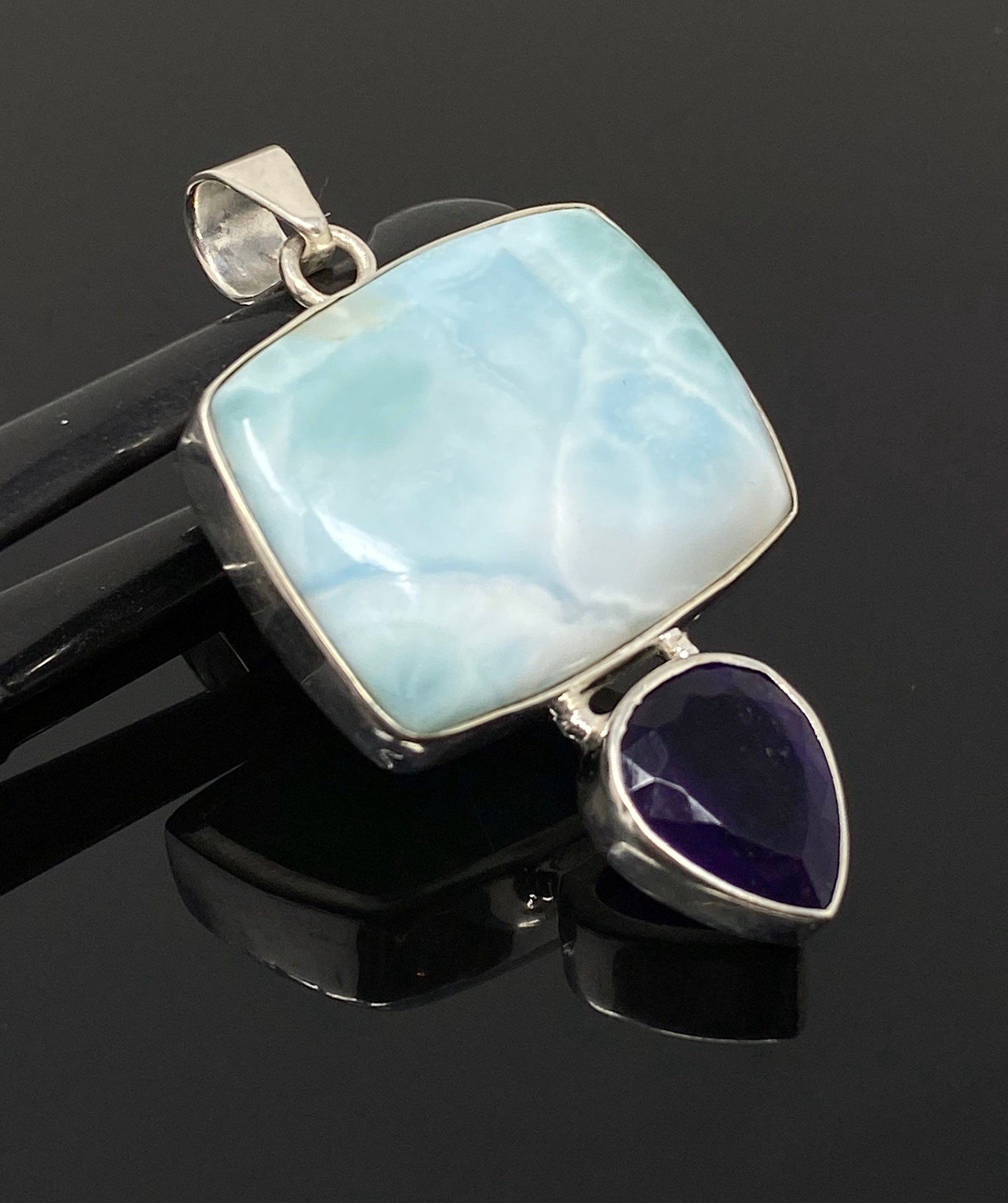 This Beautiful Handmade 925 Sterling Silver Designer Large Pendant is made with using Smooth Larimar Cabochon and Cut Stone Purple Amethyst and is an excellent choice for any occasion and makes a great gift for the loved ones.