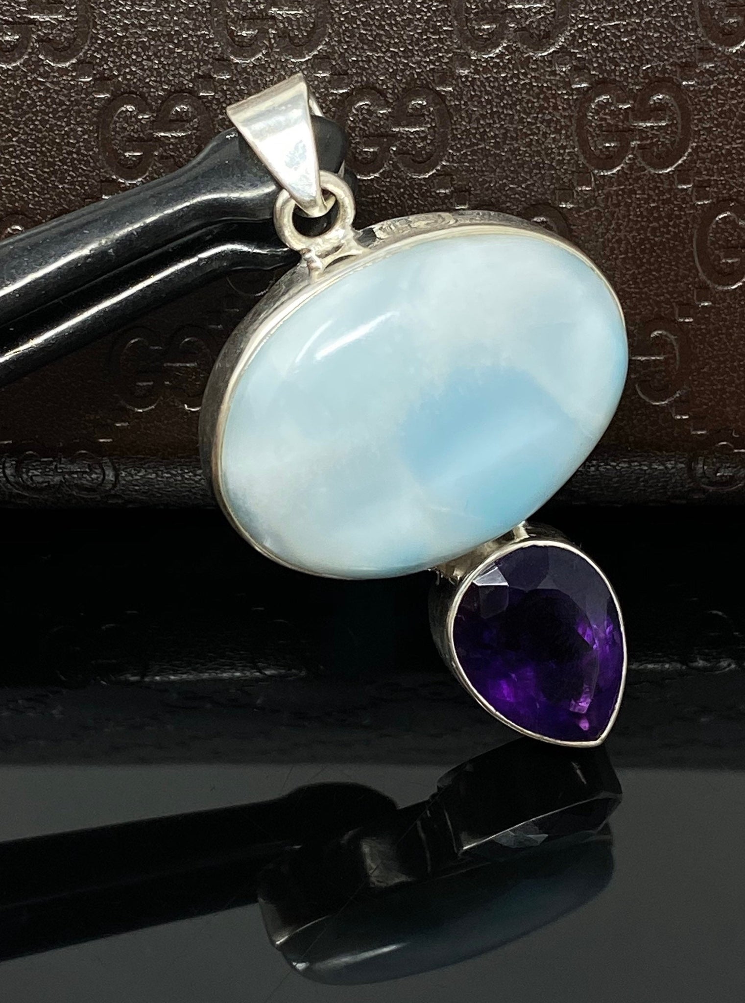 This Beautiful Handmade 925 Sterling Silver Designer Large Pendant is made with using Smooth Larimar Cabochon and Cut Stone Purple Amethyst and is an excellent choice for any occasion and makes a great gift for the loved ones.