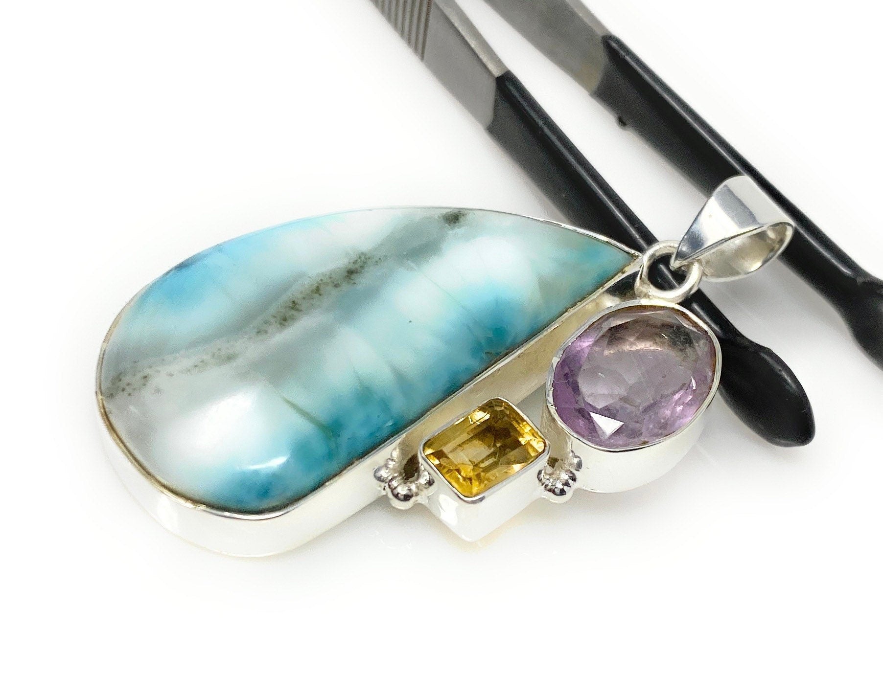 Natural Larimar with Amethyst and Citrine Gemstone Pendant, Sterling Silver Jewelry, Larimar Pendant, Amethyst Pendant, Bohemian Jewelry